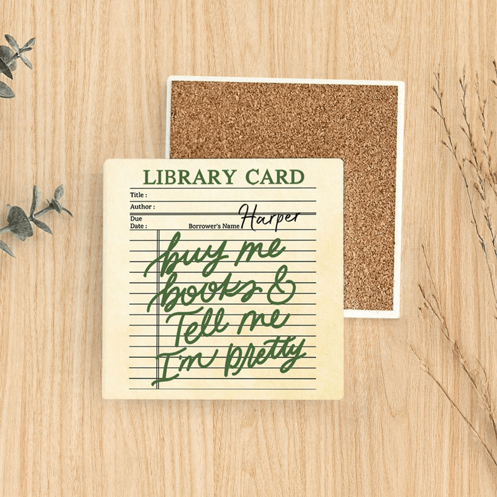 The set features a retro library card as its central design element, paired with playful reading cartoon characters that instantly evoke nostalgia for paper reading. It appeals to those who appreciate vintage culture and reading. Customizable text and names are available, transforming the mug coaster into a “personalised reading emblem.”