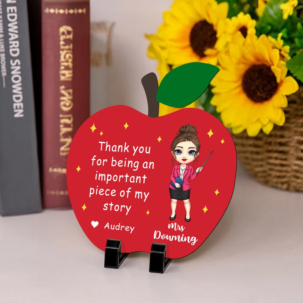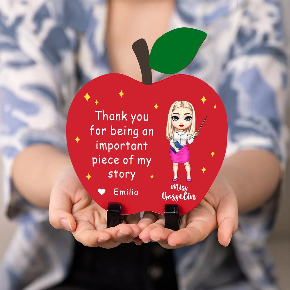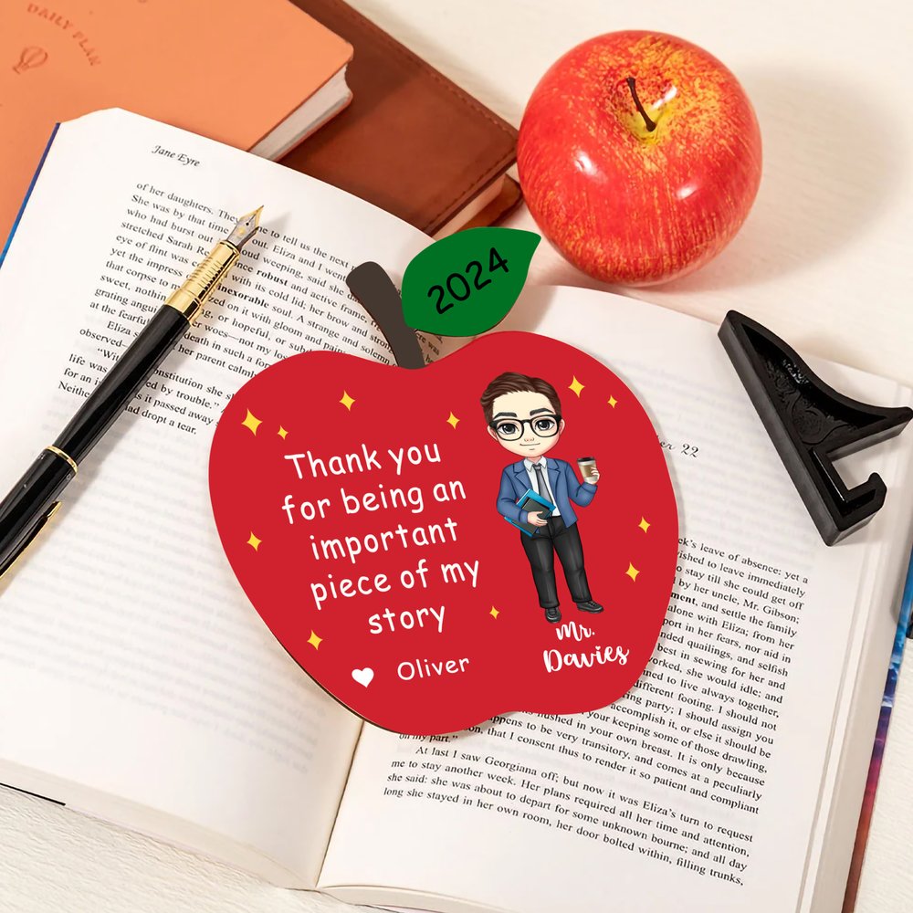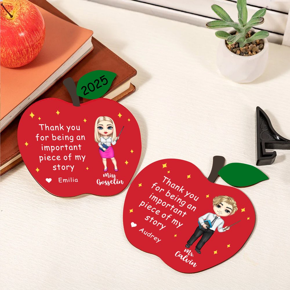 This ornament is designed with a vibrant red apple shape and a delightful cartoon representation of a teacher. The words “Thank you for being an important piece of my story” express gratitude beautifully, while the customizable name and year add a personal touch. Its cheerful design makes it a standout piece for any desk or shelf.