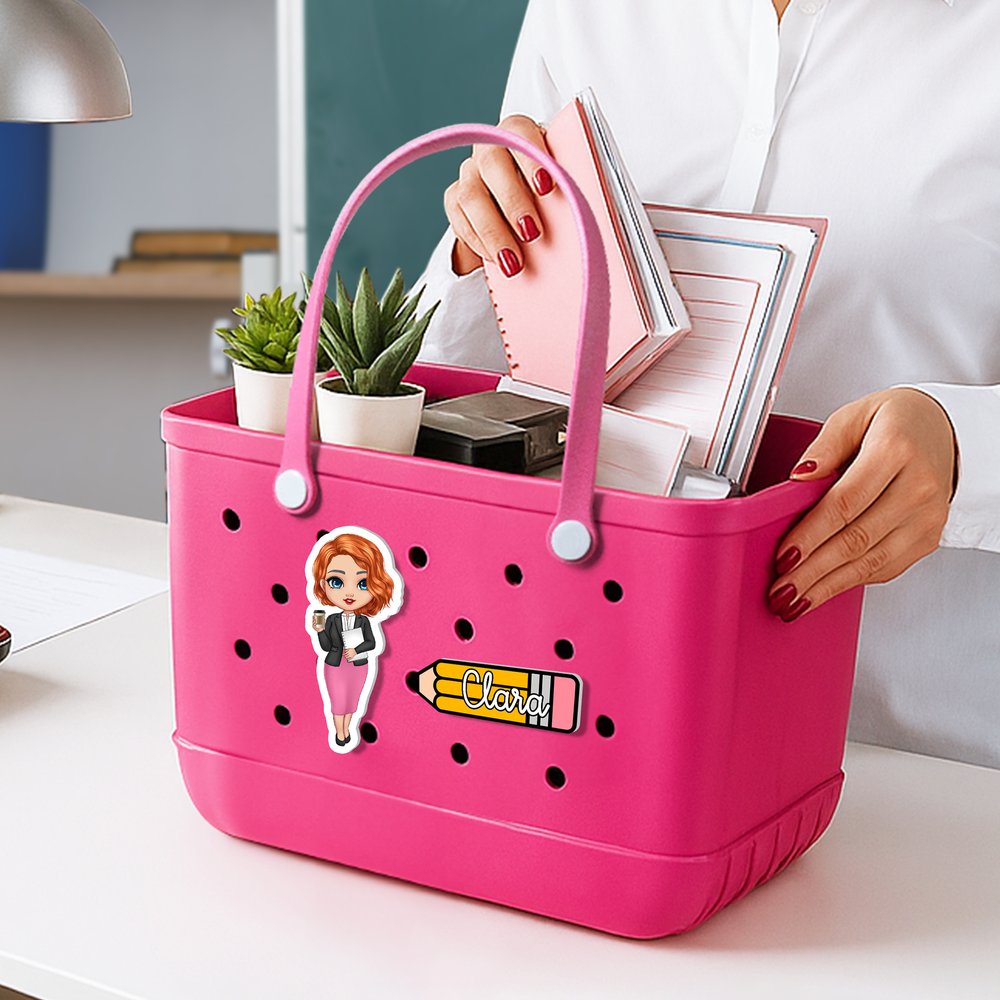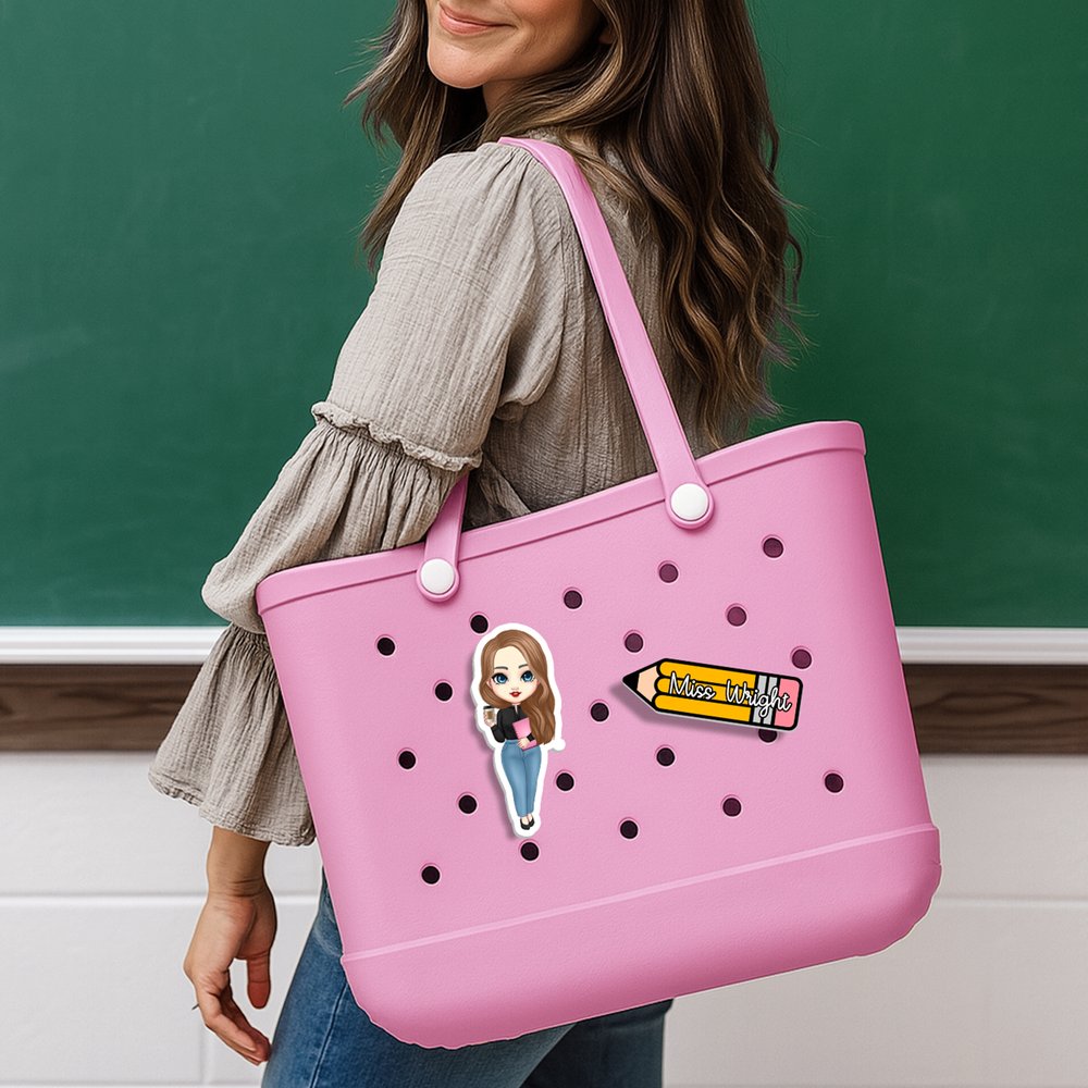 | Feature: | Cartoon Teacher Design, Pencil Design, Name Customization, Bag Charm |