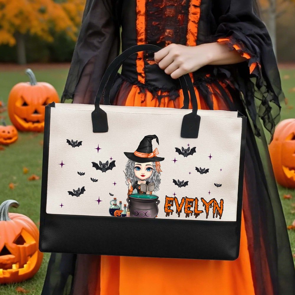 This tote bag has Halloween as its core theme, perfectly integrating cute cartoon witch images with exclusive customization, becoming an eye-catching item during the festival. The classic white and black tote bag comes with a Halloween atmosphere, adorned with patterns such as stars, bats, and magic potions. The most thoughtful feature is the customization of exclusive names, which can be printed next to the witch image, making each bag a unique "identity identifier".