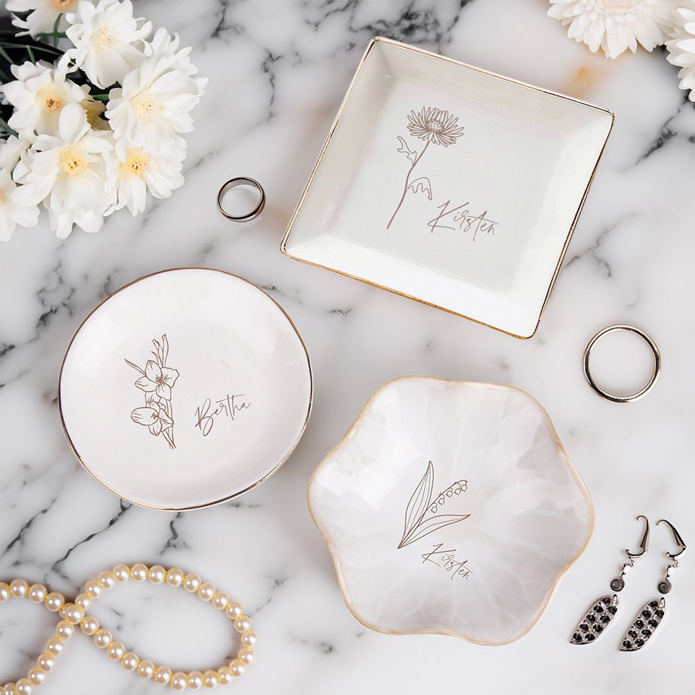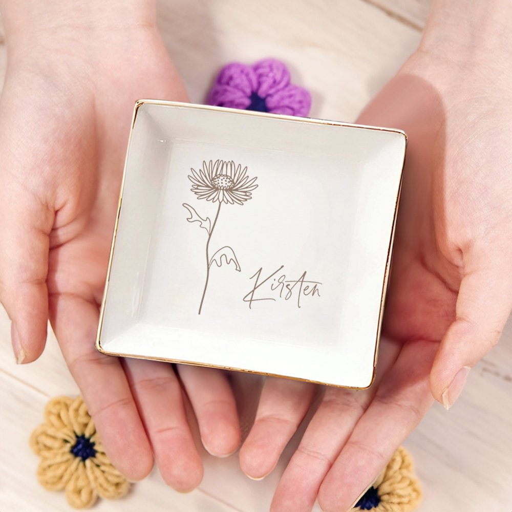 Crafted from high-quality ceramic, our ring dish boasts exquisite artistry that elevates it from a mere trinket holder to a decorative masterpiece. The delicate details of the birth flower, combined with the smooth glaze finish, create an alluring aesthetic that complements any décor and adds a touch of refined elegance.