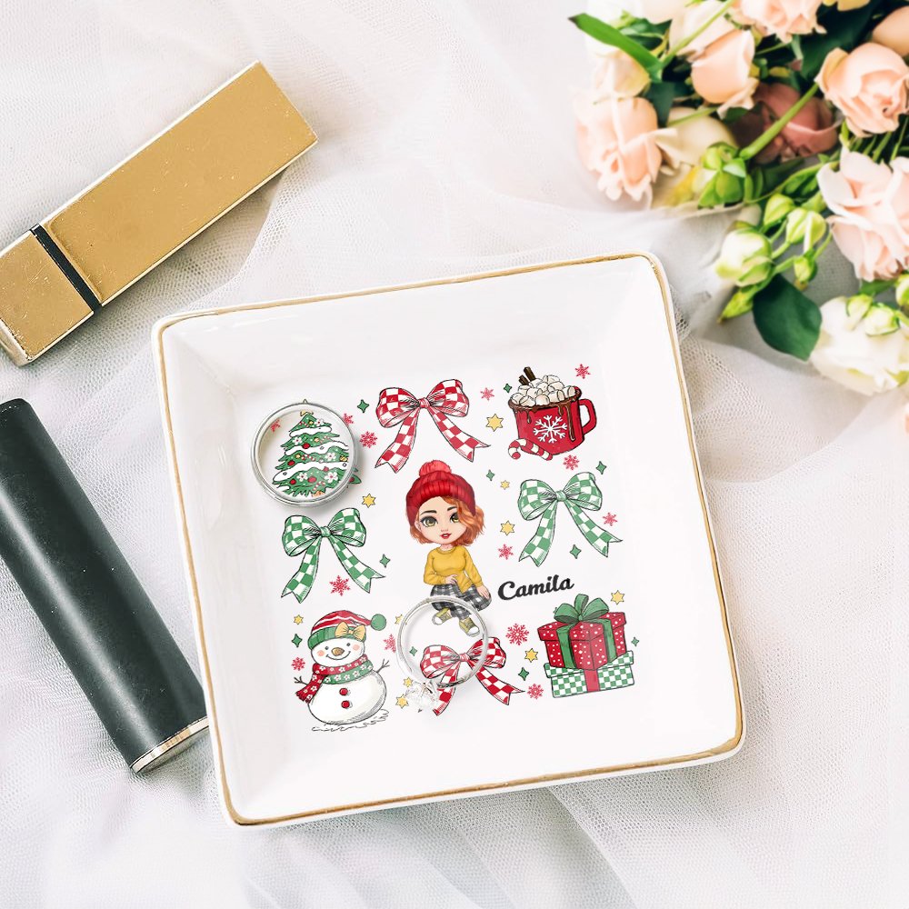 The ceramic jewellery dish is designed with a Christmas theme, adding elements such as Christmas trees, gifts, snowmen, bows, etc., showing the joyful atmosphere of Christmas. The customized cute cartoon characters, beautiful birth flowers, and personalised names make this jewellery dish more unique and personal, elevating it from a simple accessory to a precious souvenir.