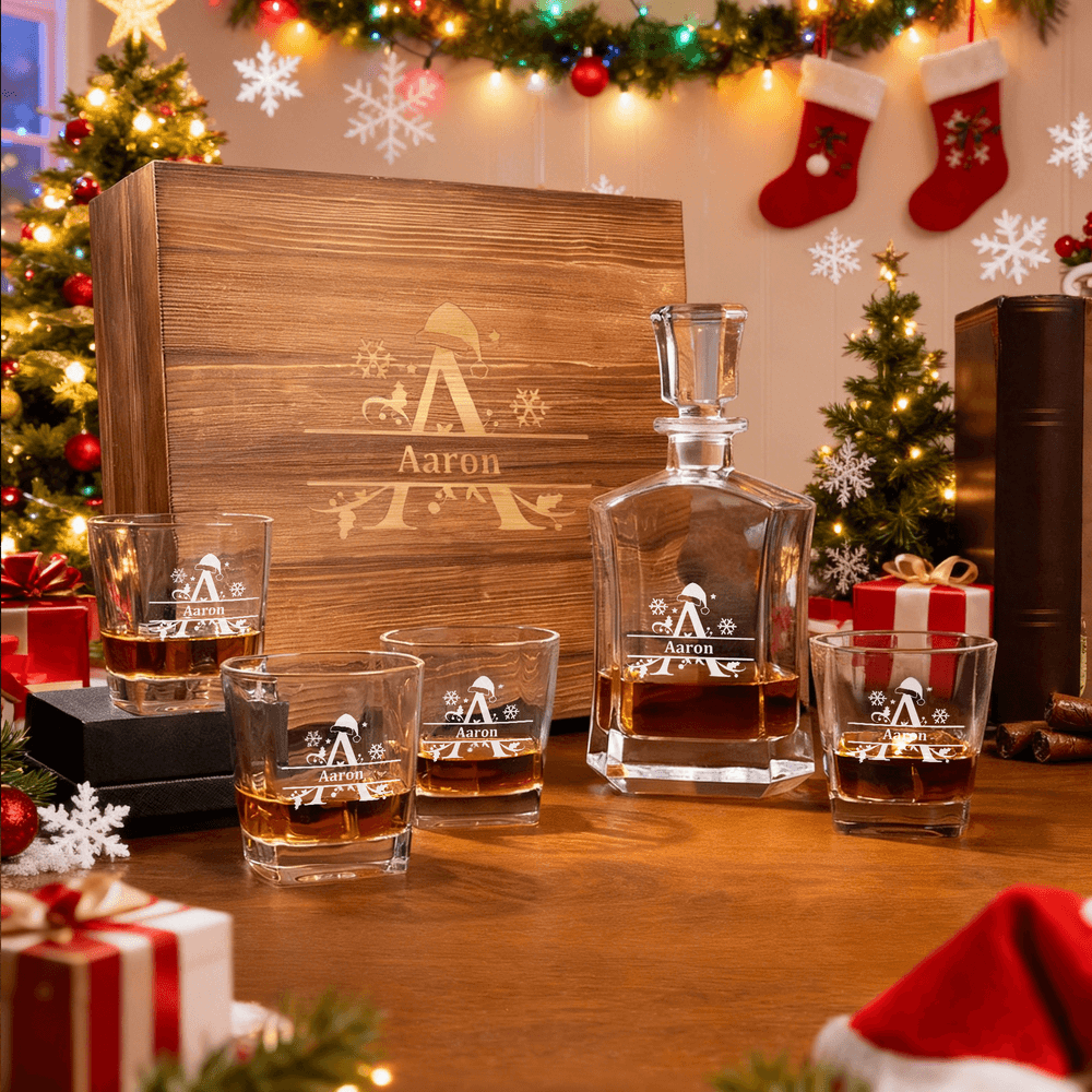 This decanter gift set showcases a festive monogram with a Santa hat, snowflakes, and holiday accents engraved on the decanter, glasses, and wooden box. Customize the initial and name to create a personalised Christmas decanter set that also doubles as warm seasonal decor.
