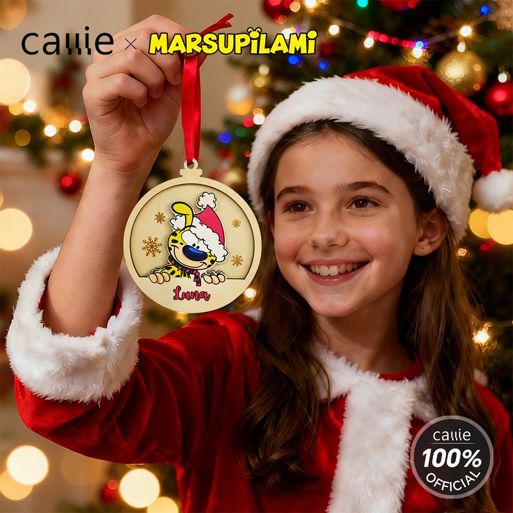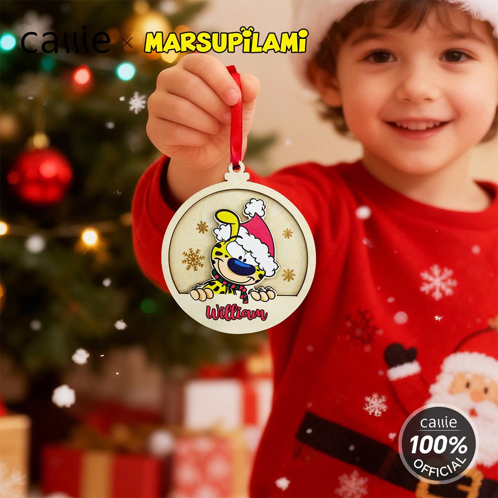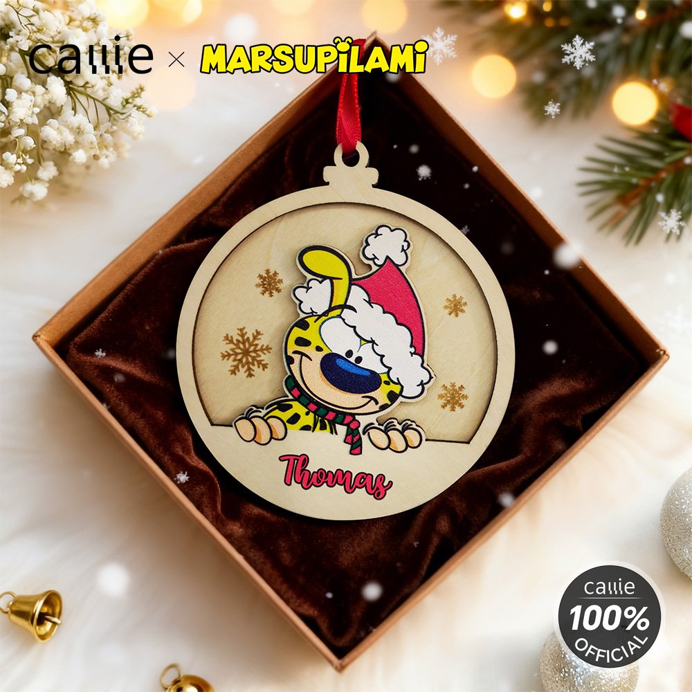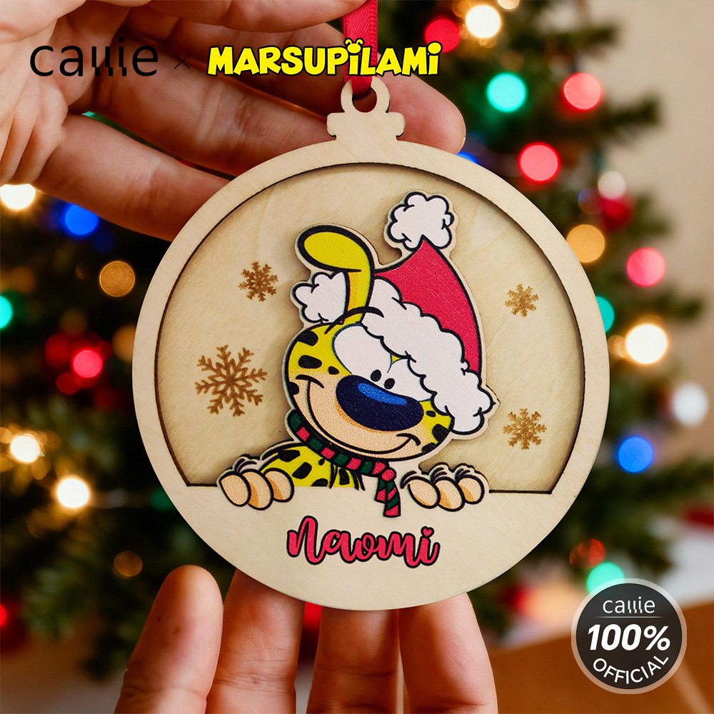 Design around the cute cartoon image pattern of Tail-Bouncing Matthew, which was created by Belgian cartoonist André Franquin in 1952. Marsupilami is a jungle-dwelling creature with yellow fur, black spots, and a super flexible, long tail. Adorned with Christmas hats and snowflakes, and with the option to customize names, each ornament becomes a unique item.