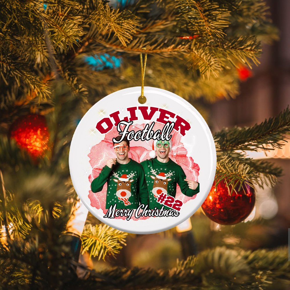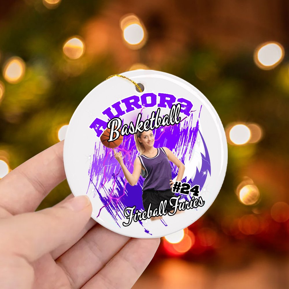 Celebrate your love of sports with our ceramic ornament! This ornament perfectly captures the spirit of energy and competition, featuring a vibrant design that showcases cool flames and eye-catching lightning. What makes it truly special is the option to Personalise it with a photo of your player, team name, and number. This customization adds a personal touch reflecting each player's unique identity and dedication to the game.