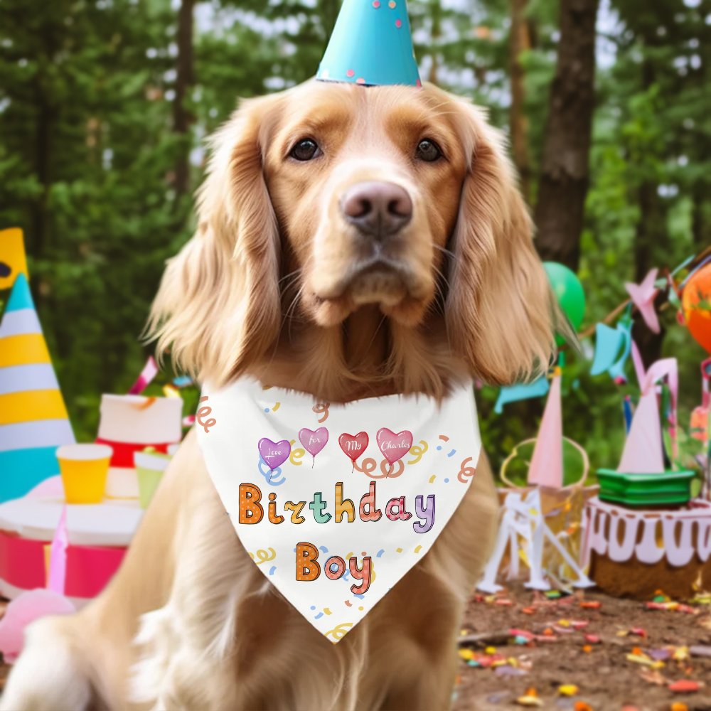 The bandana features a colourful and playful design that perfectly captures the festive spirit of a birthday party. It's adorned with balloons, and confetti pattern, and a colourful "Birthday Boy" or "Birthday Girl" text, making it a joyful accessory for your pet.