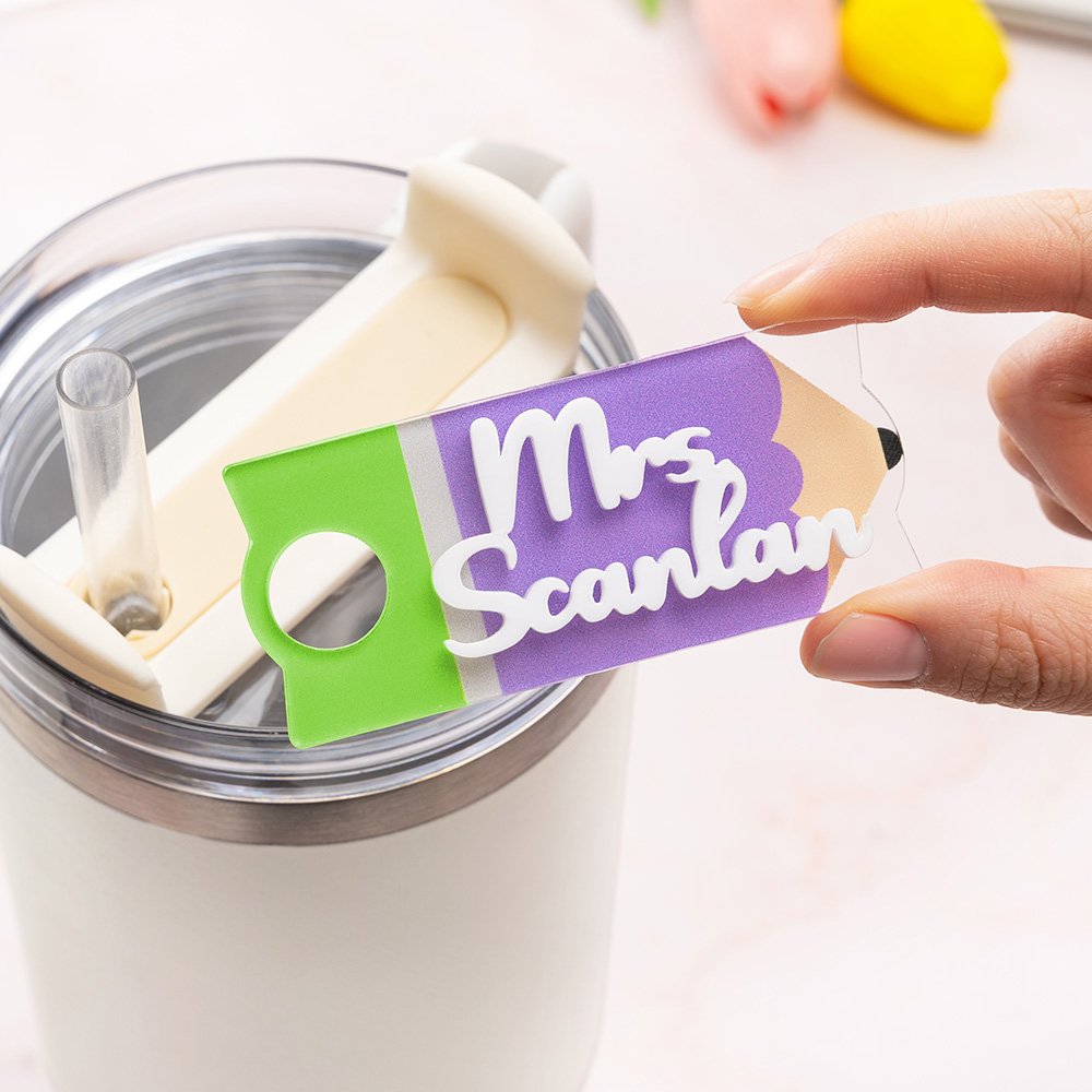 Our tumbler name plate can be customized with your own name or the recipient's name adding a touch of exclusivity to your tumbler. This accessory allows you to mark your tumbler, preventing any mix-ups with others. The pencil-shaped design is particularly suitable for teachers, symbolizing their passion, dedication, and love for teaching.