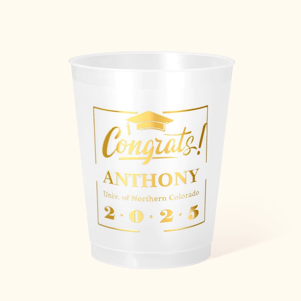 These frosted graduation cups feature a stylish design that includes graduation caps, geometric shapes, and the word "Congrats." You can Personalise each cup with the graduate's name, graduation year, and school, making them a unique and memorable addition to any graduation party.