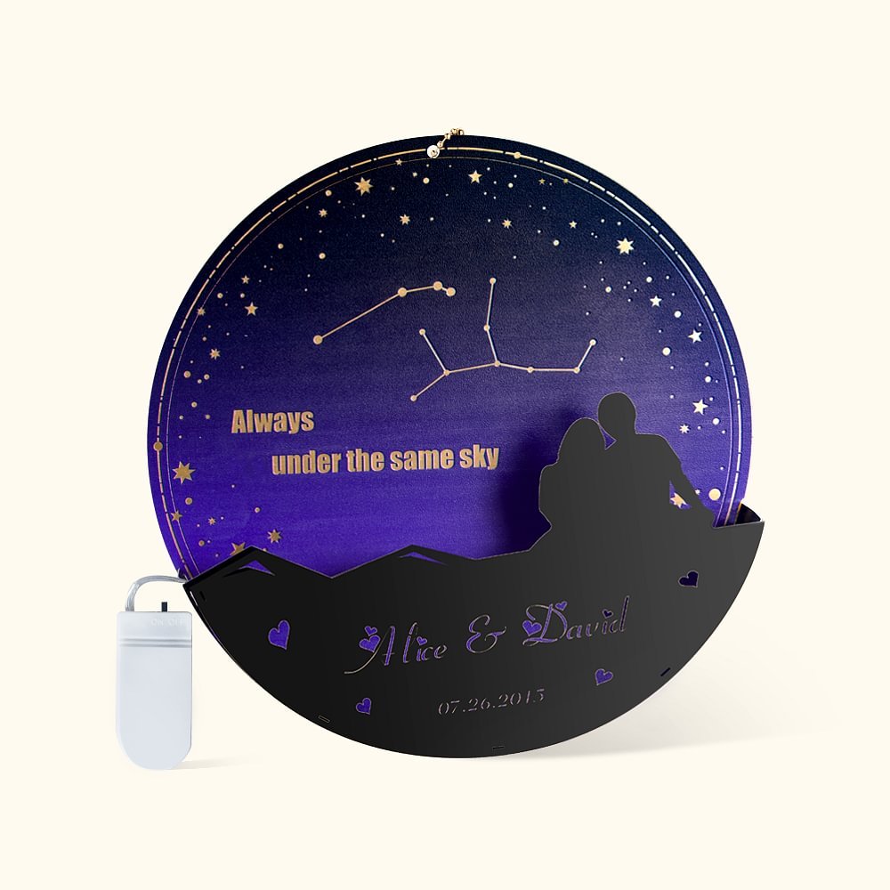 "Always under the same sky". Our hearts are always together, suitable for sending each other between lovers. The background is a custom-made starry sky of two people's constellations, coupled with a silhouette of snuggling and looking up at the starry sky, echoing the situation of the sentence. When the night light is on, there is a more romantic atmosphere.