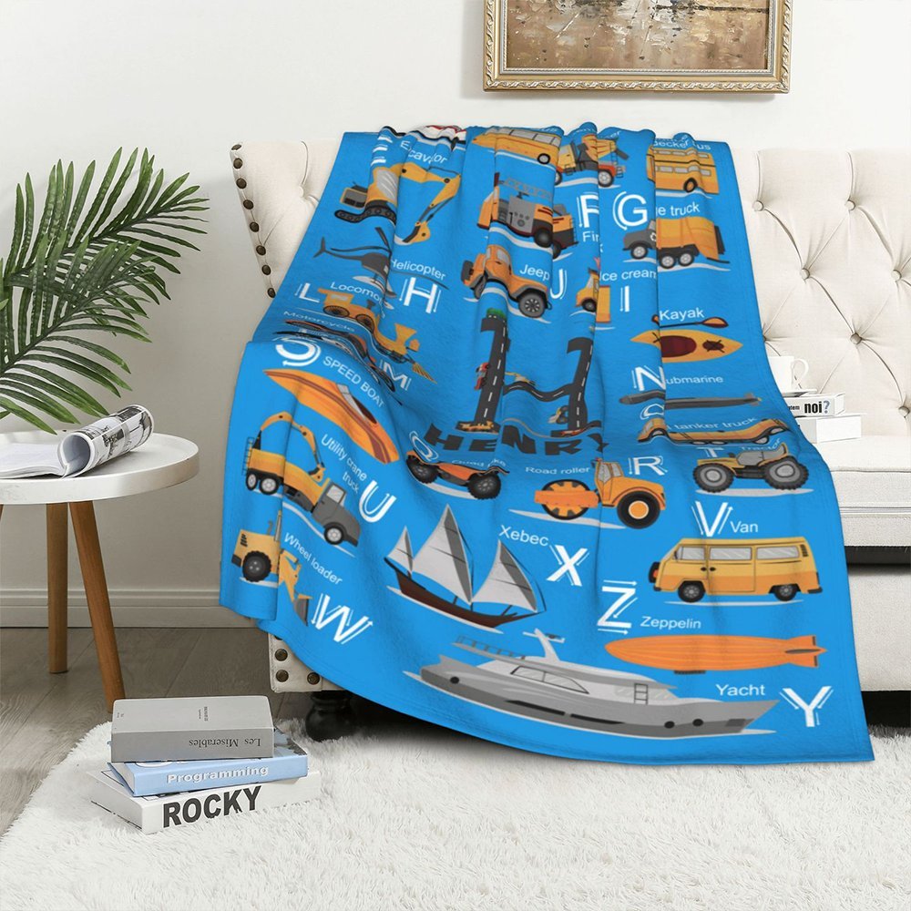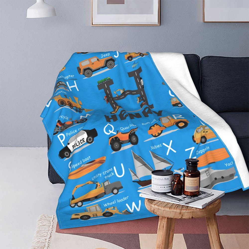 Personalised Transportation Vehicle Kid Blanket with Initial and Name Educational Alphabet Home Decoration Birthday Gift for Kid Boy