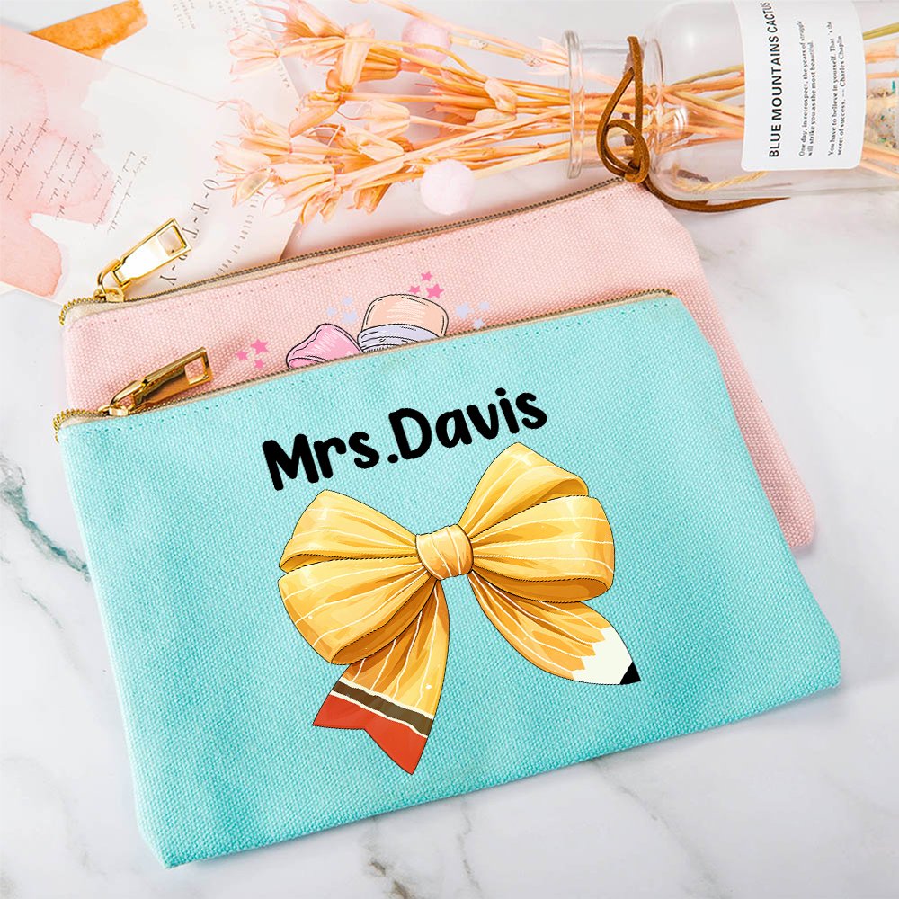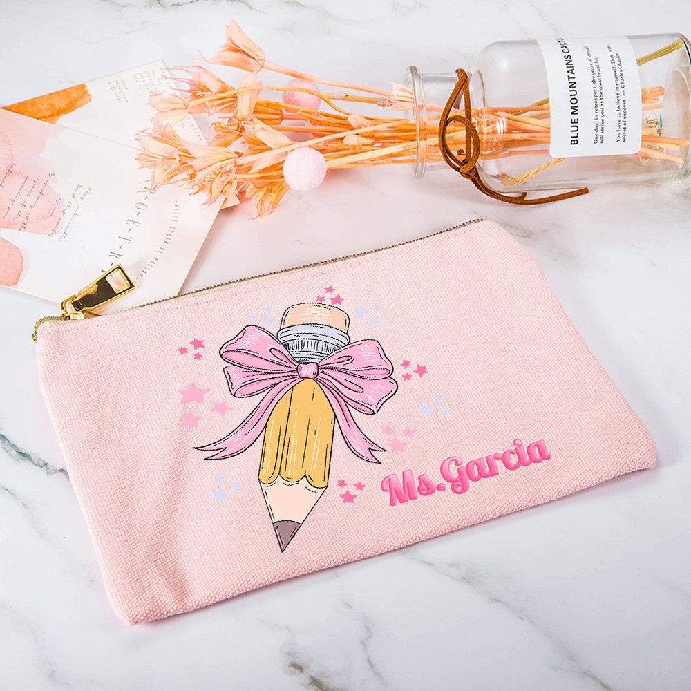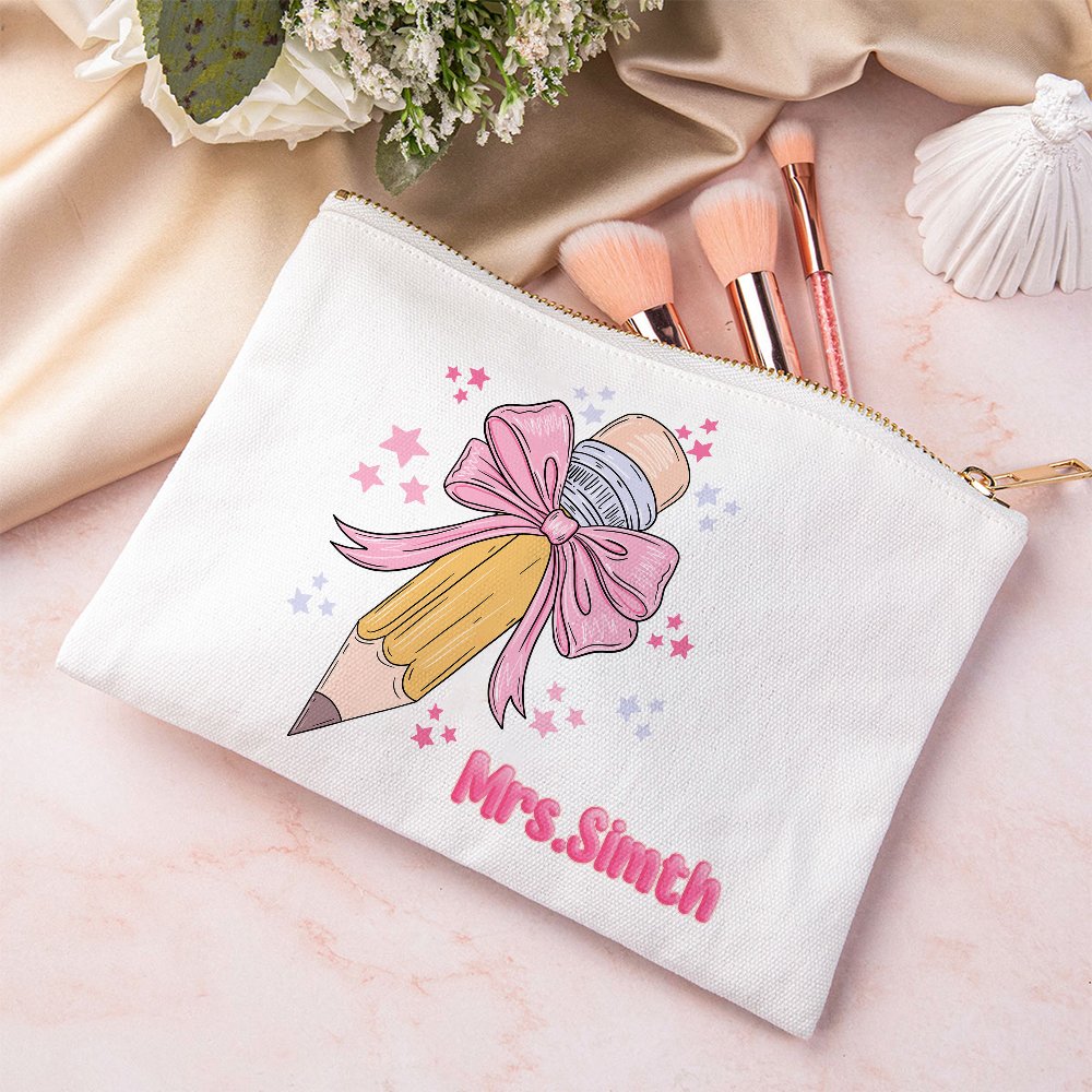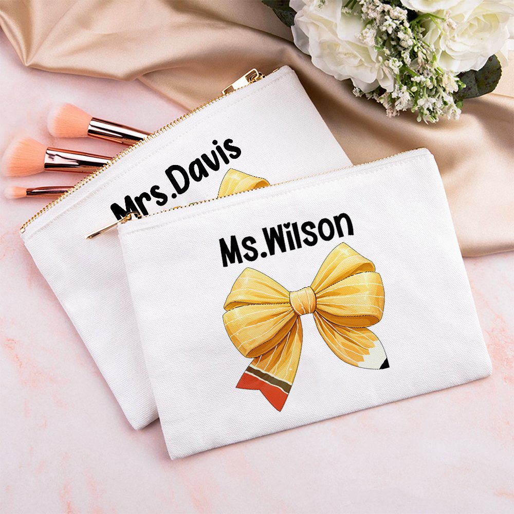 This enchanting makeup bag beautifully blends the graceful elegance of a bow with a delicate pencil pattern. Featuring two distinct designs, you can select the style that best complements your personal aesthetic. At the same time, it also allows you to add the teacher's name, adding a personal touch and making it truly one-of-a-kind.
