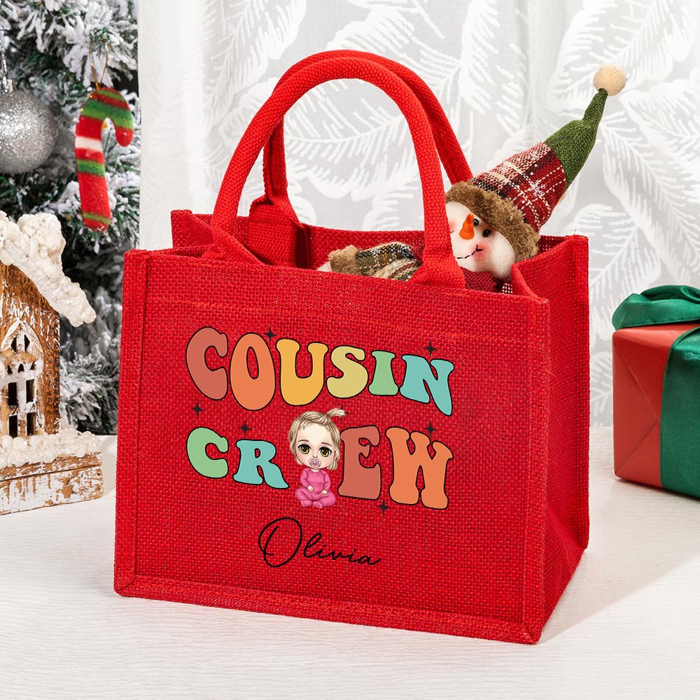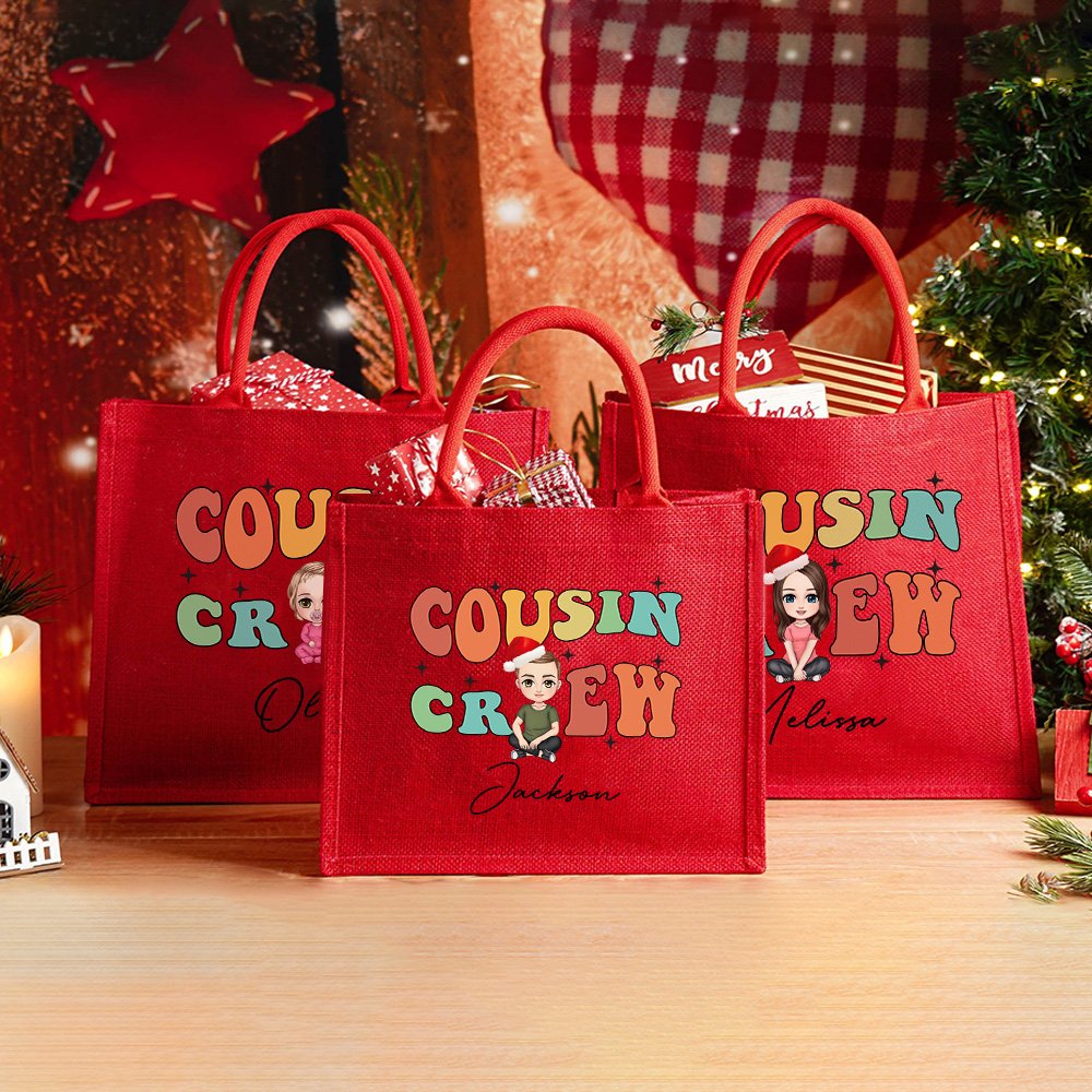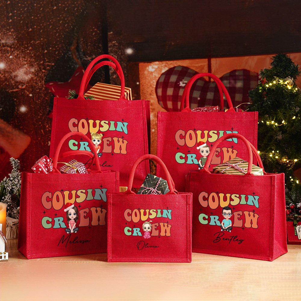 Personalised Cousin Crew Cartoon Character Large Red Burlap Tote Bag with Name Party Favor Christmas Gift for Kids Adults