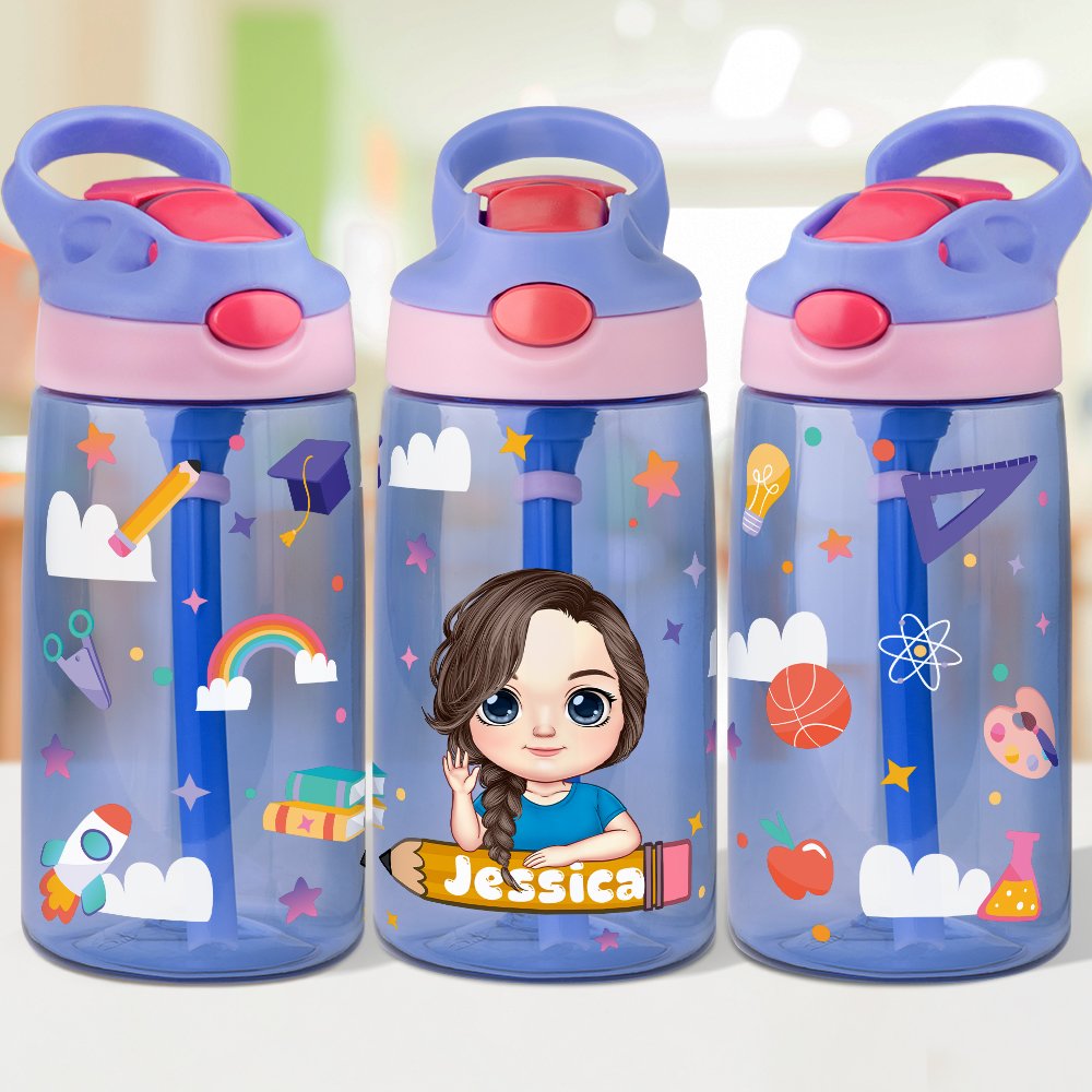 This water bottle is available in four colours, with a customizable cartoon character on the front, playfully nestled on a pencil, combining creativity with innocence. The cup body is decorated with fun elements such as rainbows, stars, books, etc., capturing the innocence and dreams of childhood. Each water bottle can be printed with your child's name, making it a unique item that reflects your child's personality and preferences.