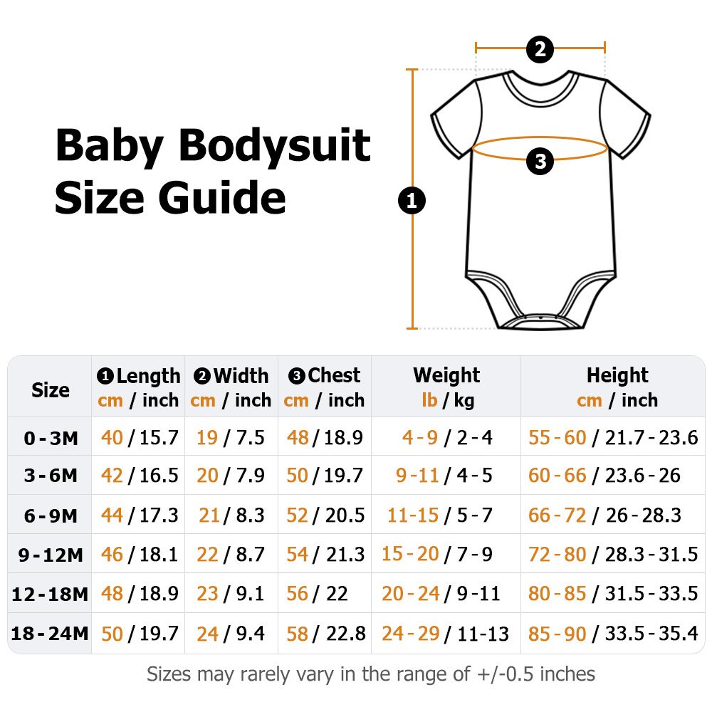 Measurement: Short-Sleeve Bodysuit - 0-3M, 3-6M, 6-9M, 9-12M, 12-18M, 18-24M Long-Sleeve Romper - NB, 0M-3M, 3M-6M, 6M-9M, 9M-12M, 12M-18M, 18-24M Bib - 11.02" × 7.09"(28cm × 18cm)