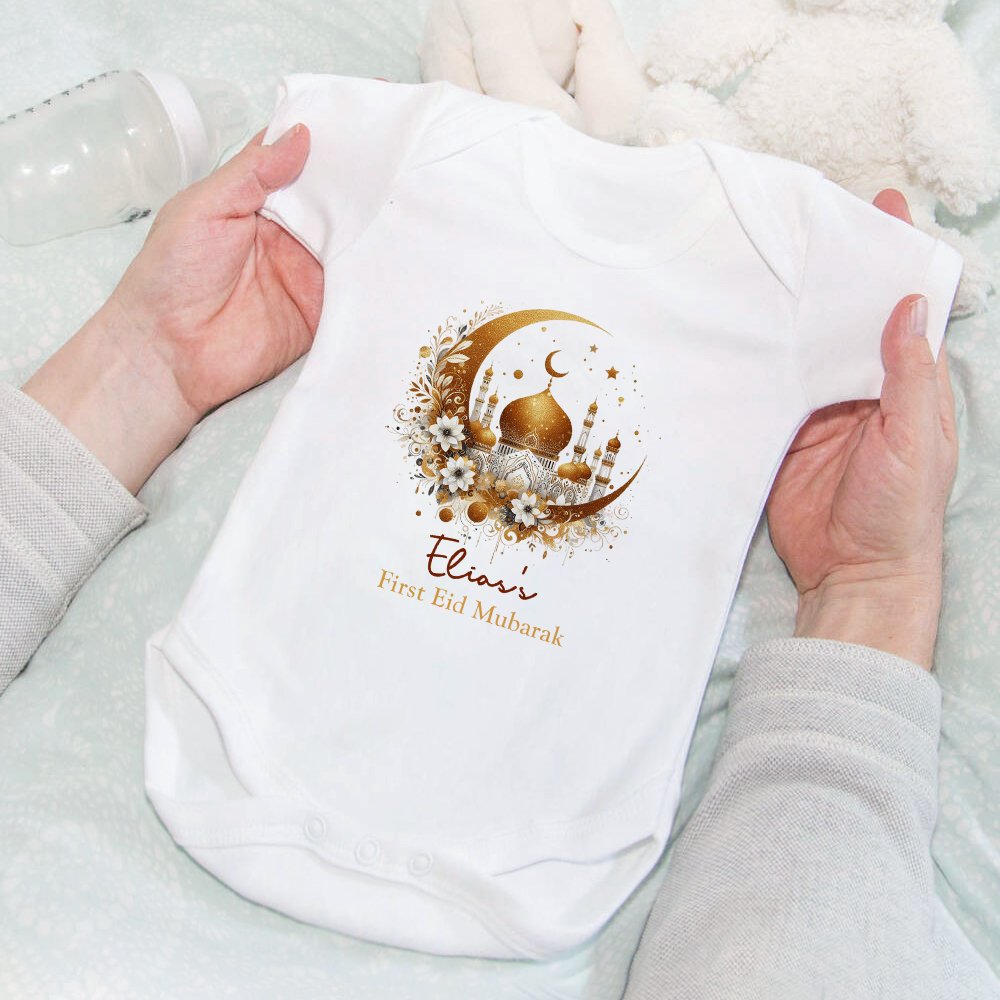 Personalised Crescent Moon Mosque Pattern 100% Cotton Soft Baby Bodysuit Romper Bib Set with Name First Eid Mubarak Gift for Newborns Babies