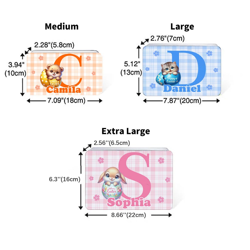 Its checkered background features a cute animal peeking from an Easter egg, paired with a large matching initial and the child’s name. Delicate flower accents add a sweet touch, blending Easter’s cheerful spirit with personalization to create a tin that’s both functional and full of festive charm.