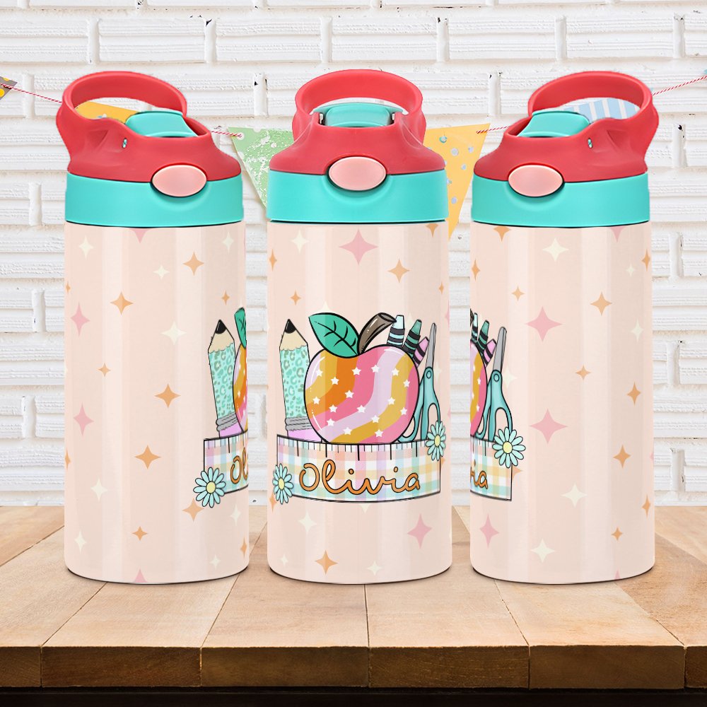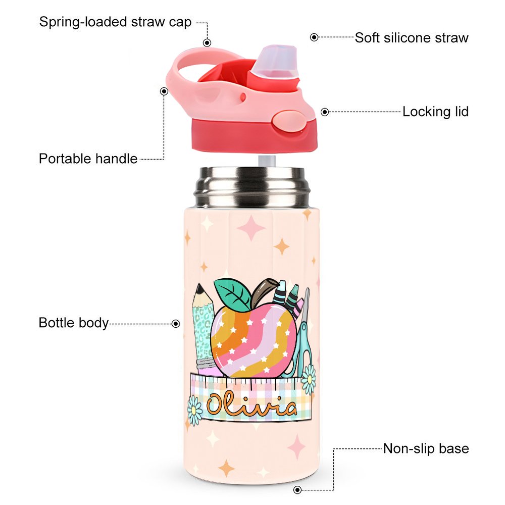 Personalised Cute Apple Stationery 12oz Insulated Water Bottle with Name and Silicone Straw Back to School Birthday Gift for Kids