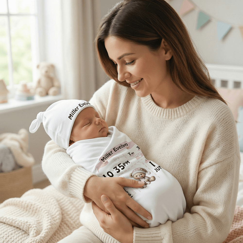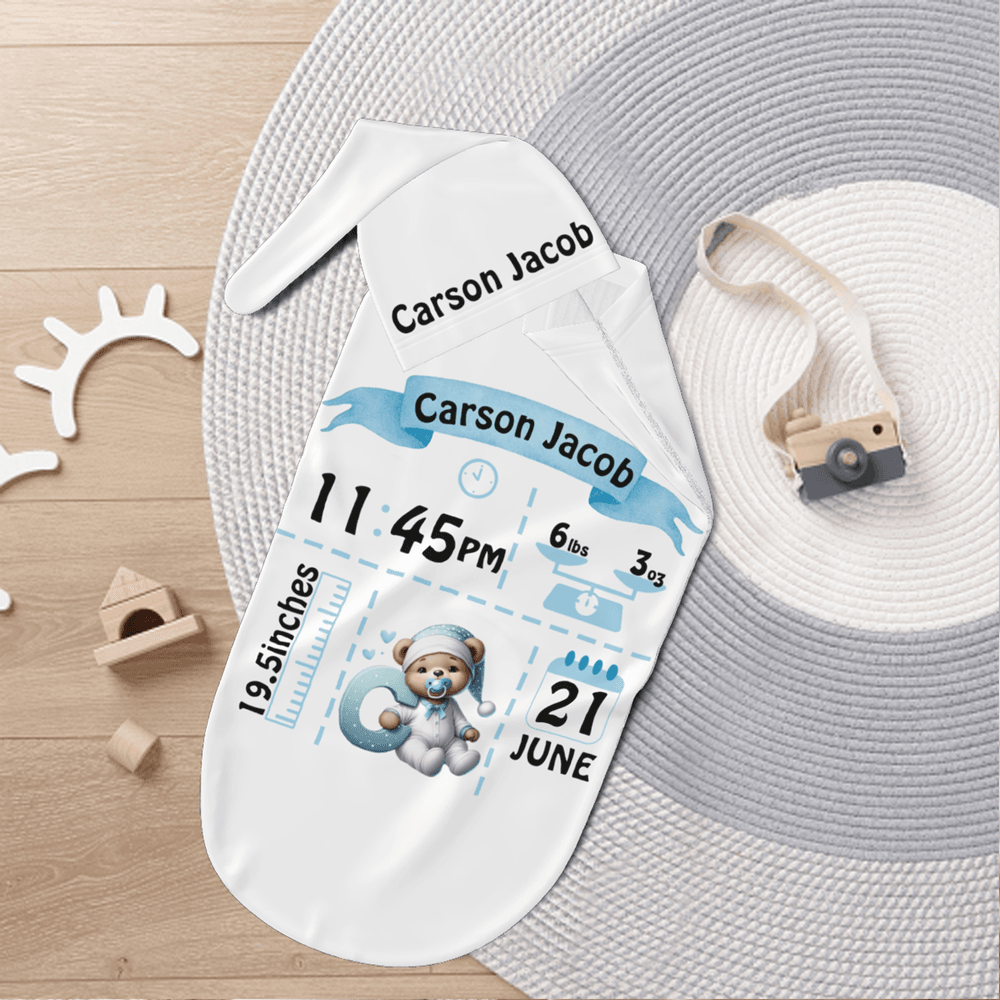 Our little-bear swaddle blanket and hat set features an adorable bear motif, specially created for newborns and infants. The blanket can be personalised with the baby’s initial, full name, and brief birth details (such as birth date, weight, and length), paired with soft, coordinating colours for a look that’s both charming and deeply meaningful.