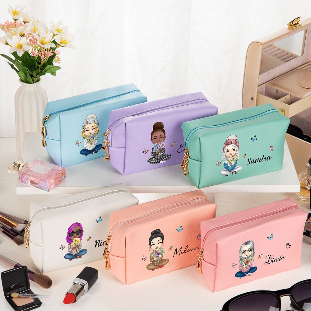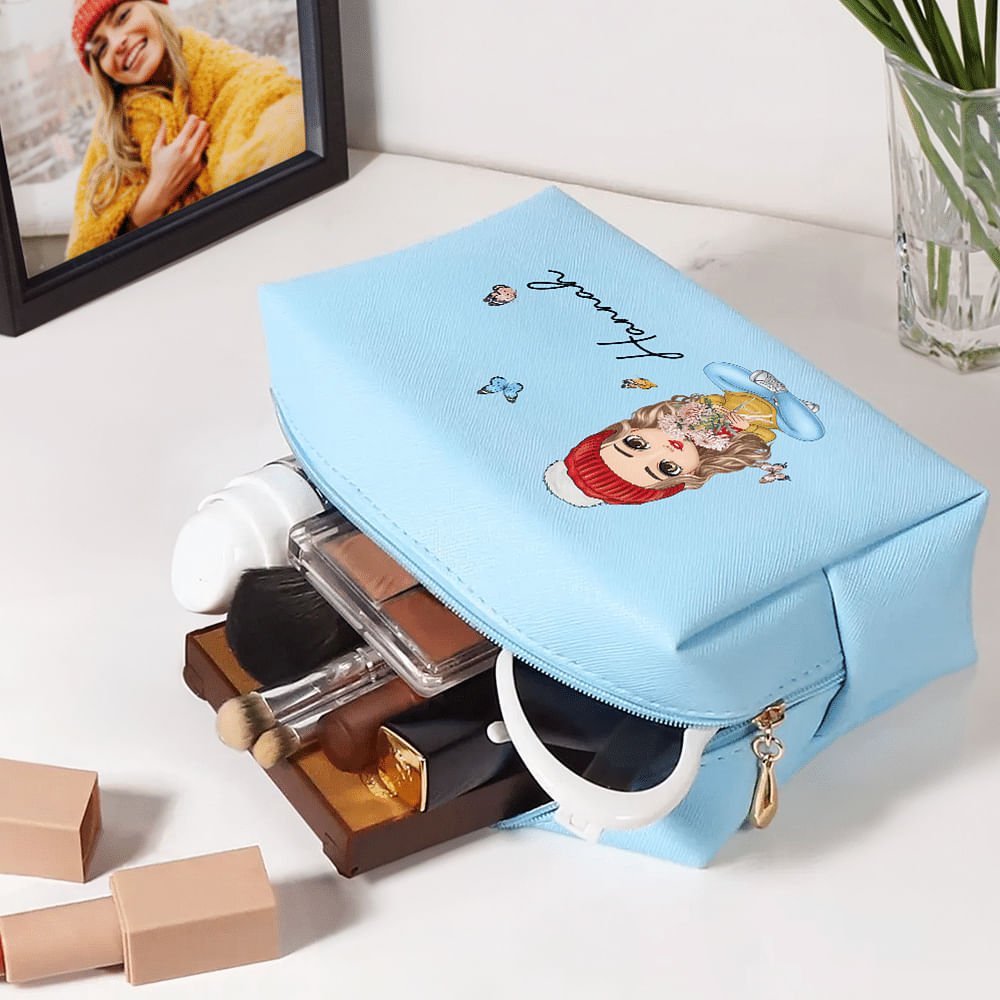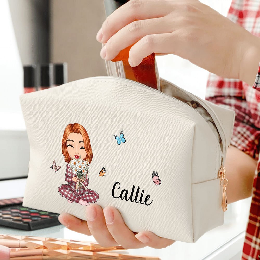 This unique makeup bag combines charming cartoon characters with birth flower bouquets, creating a playful yet sophisticated aesthetic. Each bag is Personalised with the recipient's name, making it a truly individual piece. The whimsical design appeals to those who appreciate cute characters and floral elements, making it stand out from traditional makeup bags.