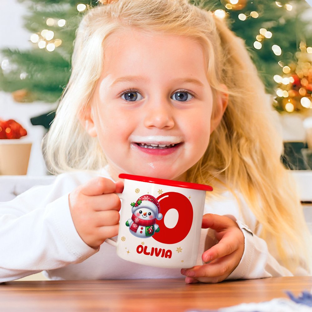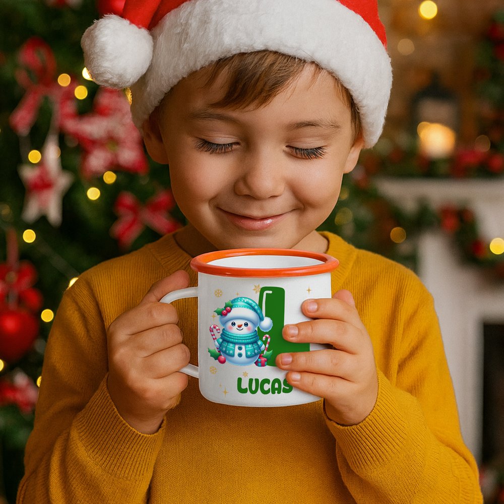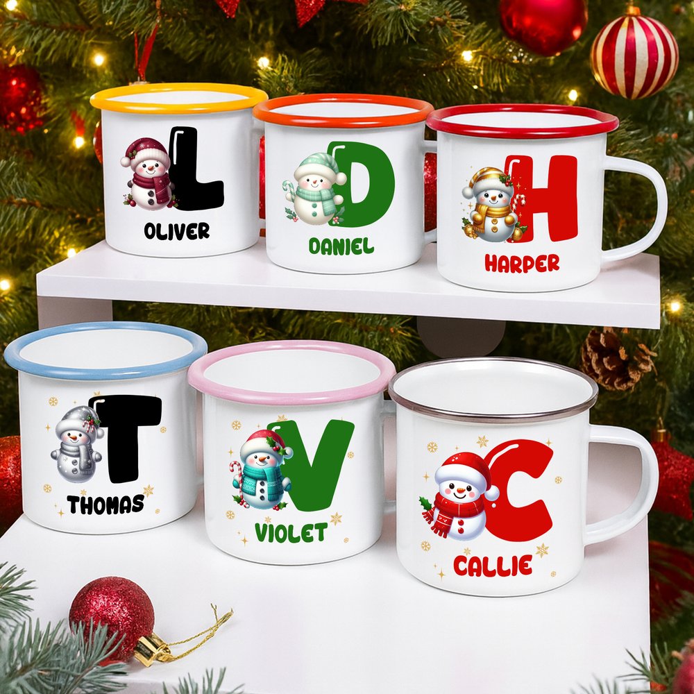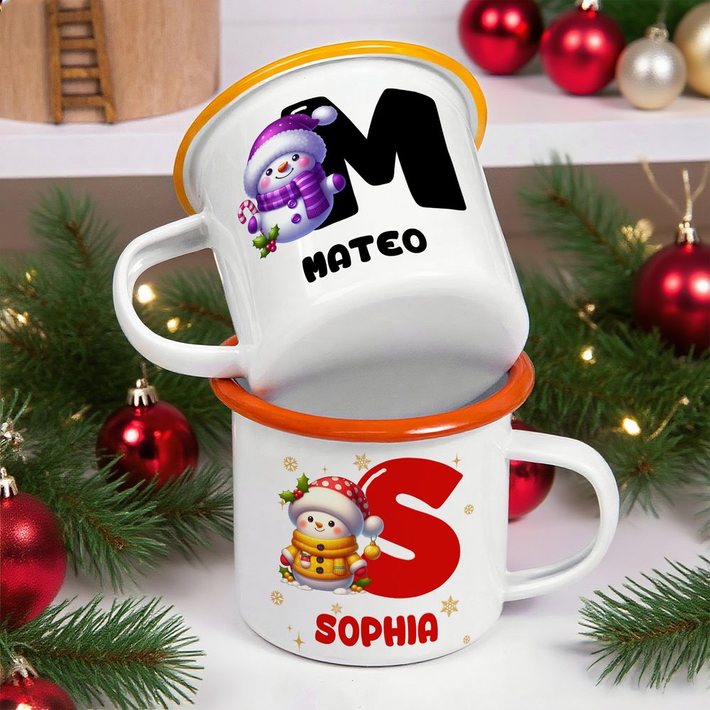 Personalised Cute Cartoon Snowman Initial 12 oz Enamel Mug with Name Christmas Gift for Boys Girls