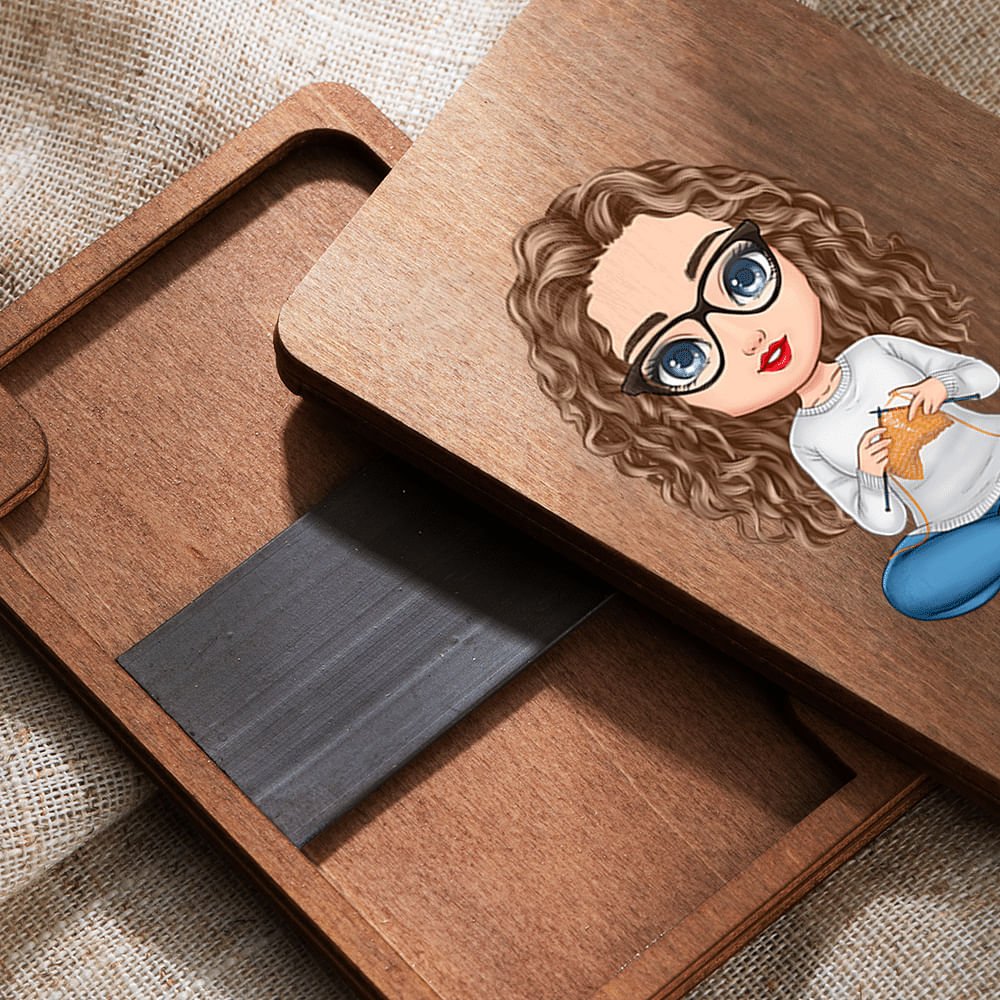 Our needle box stands out with its unique design. The wooden exterior with characters that reflect the recipient's style adds a touch of classic elegance to this pin box. You can customize it with a female cartoon character and name to make it even more special.