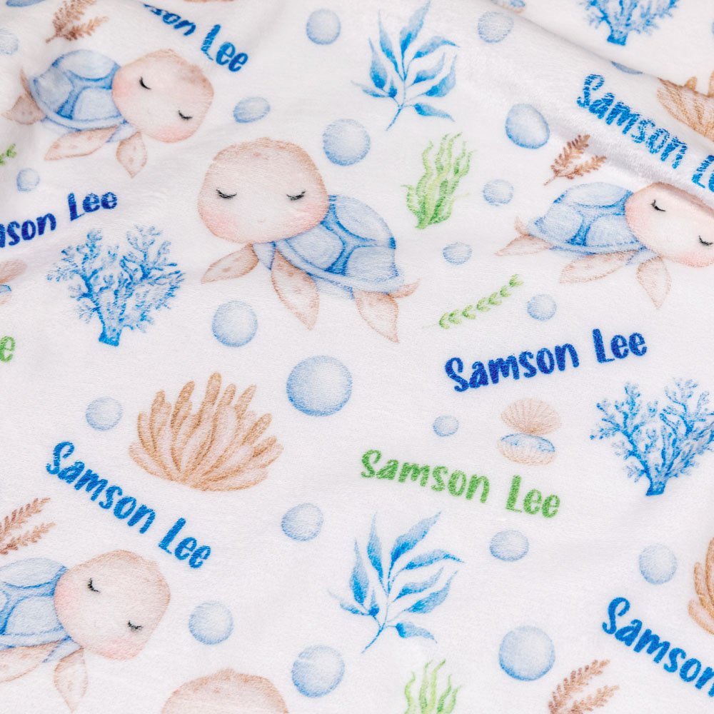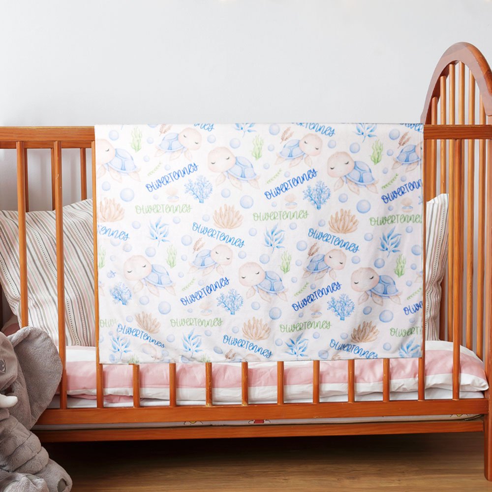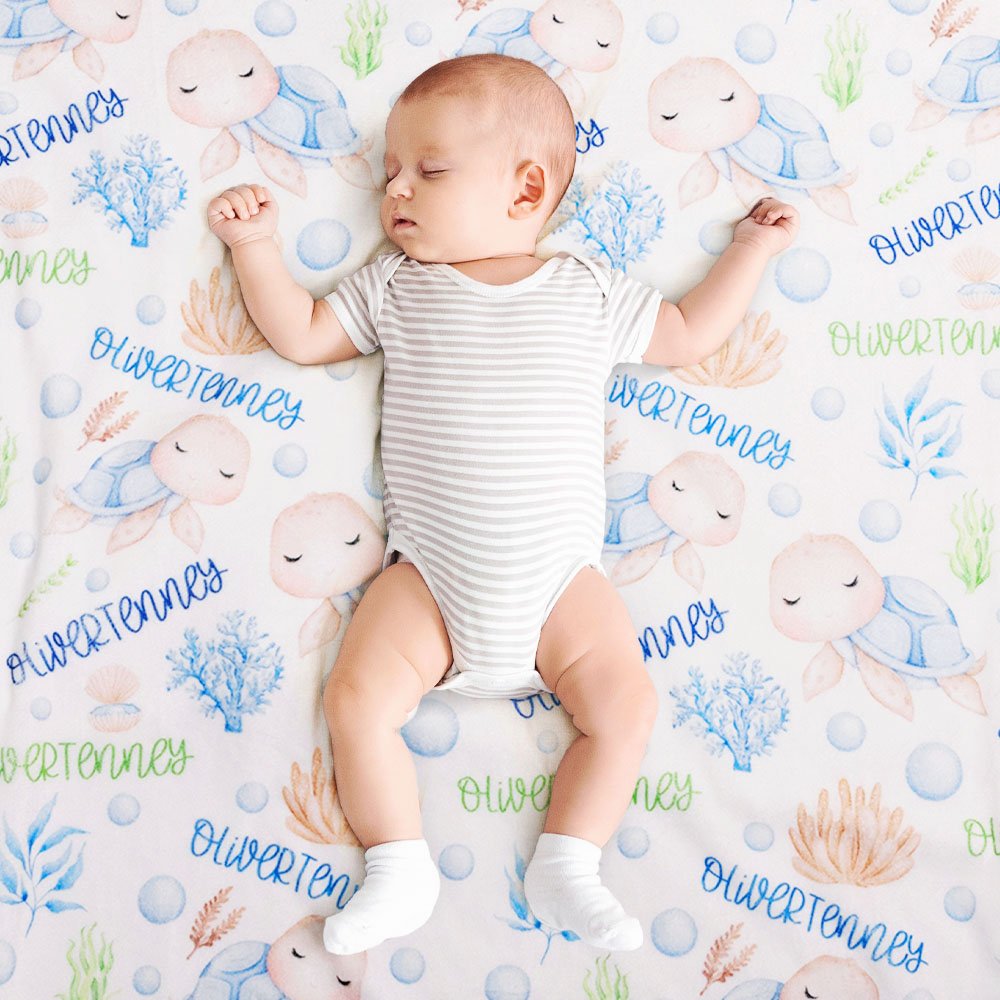 Featuring a healing style and warm tones, this blanket is filled with cute cartoon turtle and shell elements, creating a cozy atmosphere. You can add your child's name to the blanket, a unique design element that adds a touch of charm, making it a delightful home essential for any occasion.
