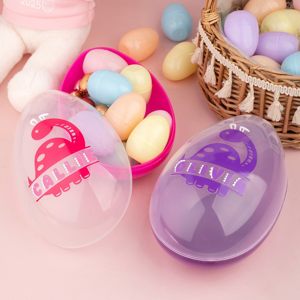 This charming dinosaur-themed Easter egg is designed to bring joy and excitement to children of all ages. It features a customizable space for your child's name, making it a special keepsake that adds a personal touch to their Easter celebrations. The delightful dinosaur design makes it a wonderful addition to any holiday tradition.