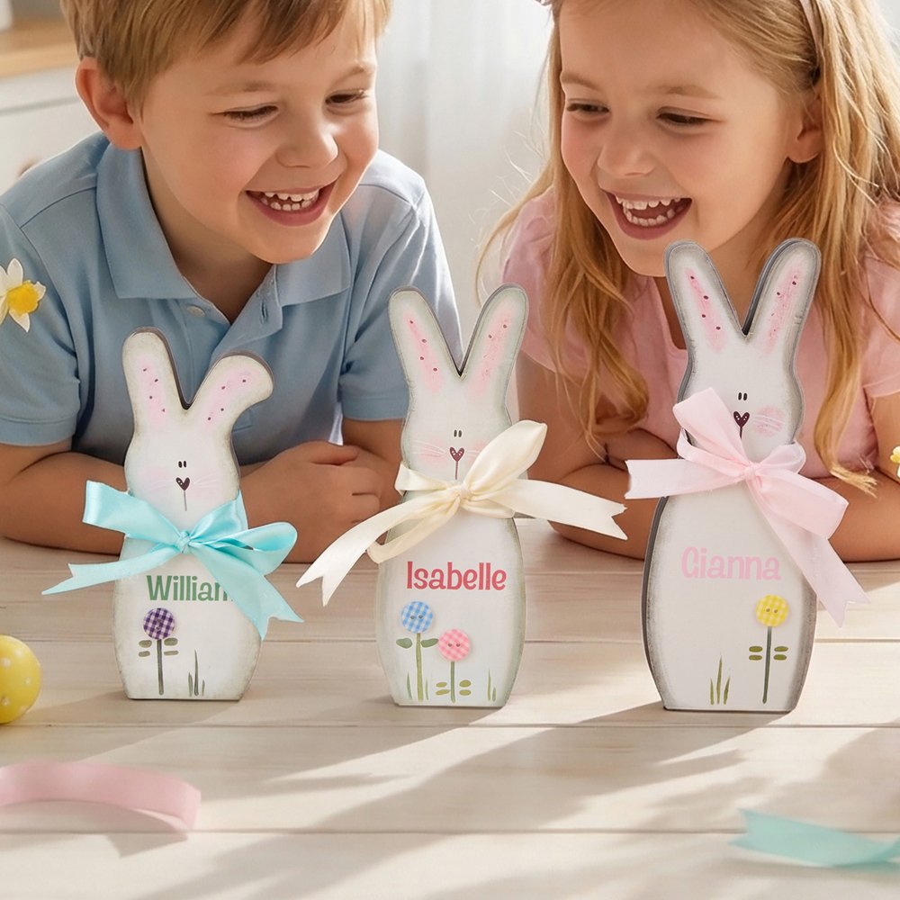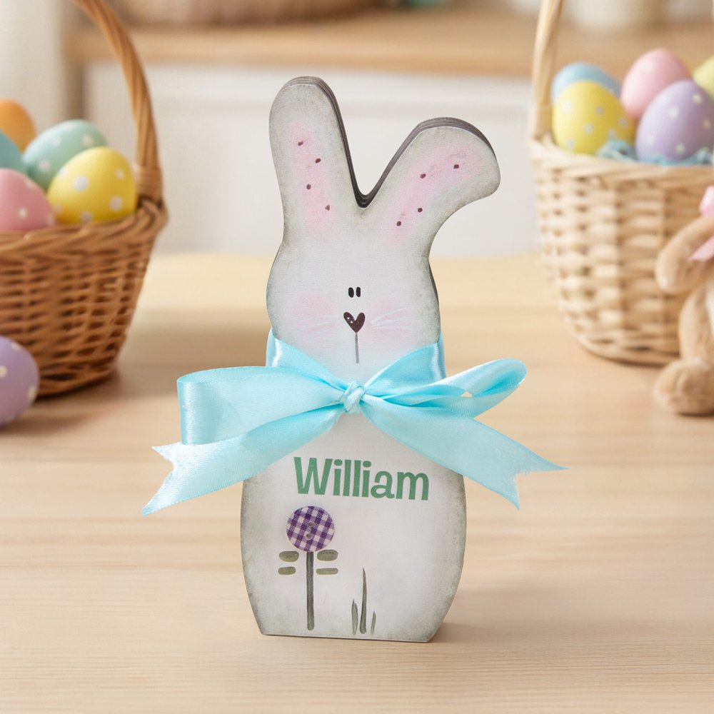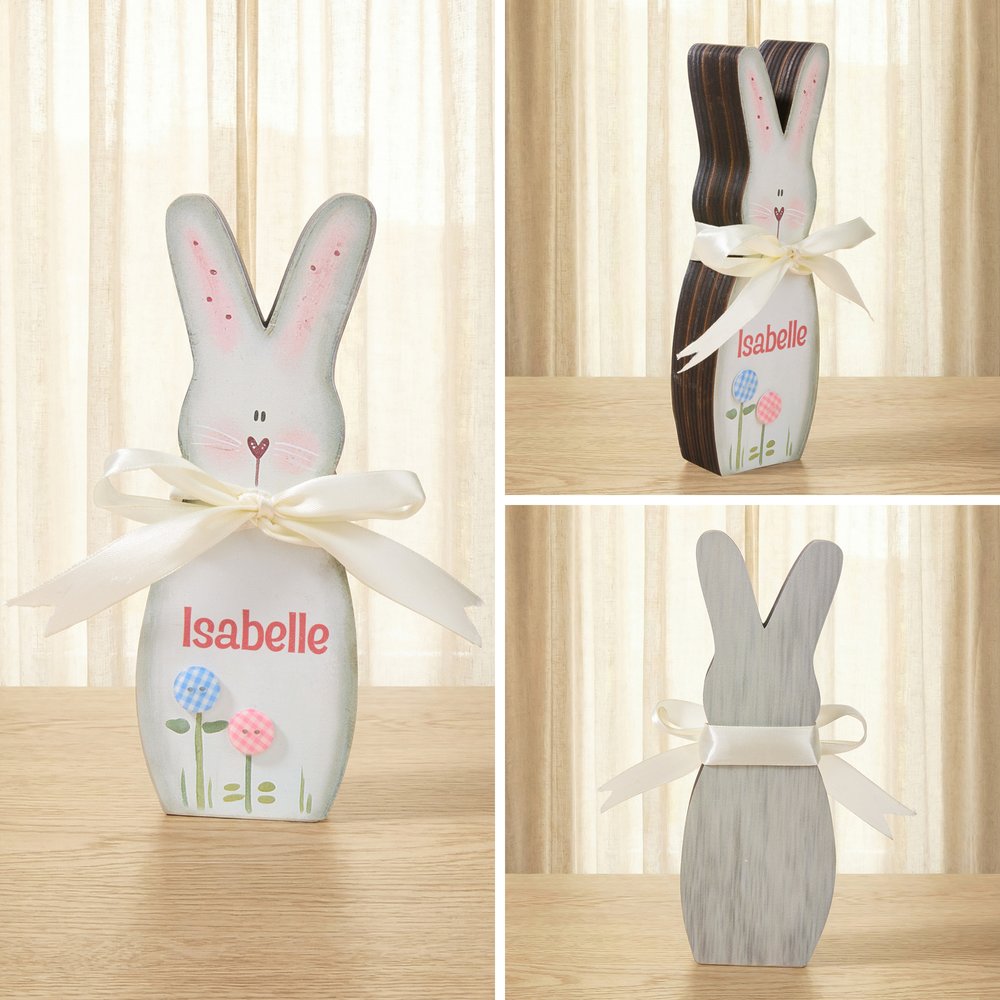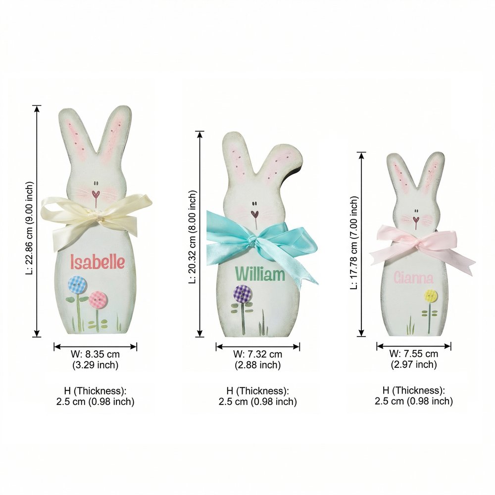 Features adorable Easter bunny shapes with three bunnies in poses, paired with a rustic distressed wood texture, checkered flowers, and ribbon bows for a charming, festive look. It supports customization of the name, with multiple colours available. The 3-piece set can be displayed together or separately, adding layered decoration and a warm Easter atmosphere to any space.