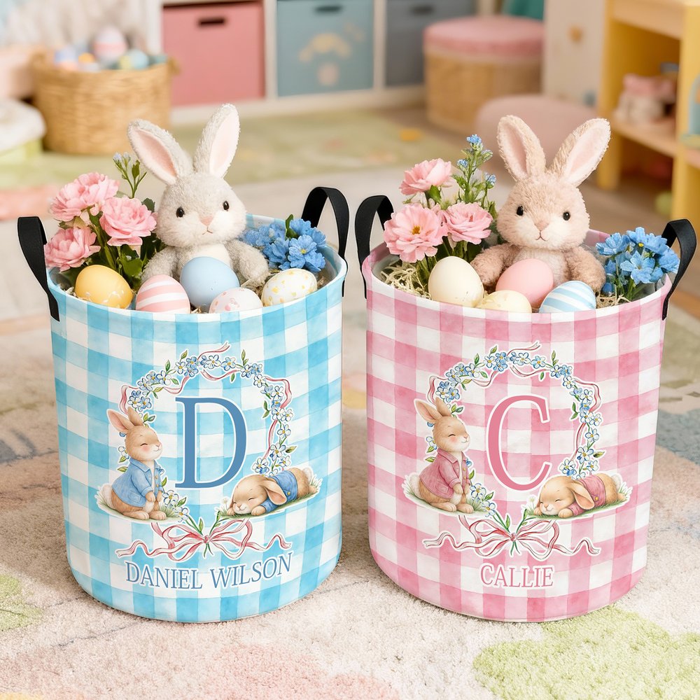 This laundry basket features an Easter bunny as its central design element, with an elegant plaid background complemented by a wreath, a bow, and cute bunnies, creating a cheerful and playful springtime atmosphere. It supports customization with a personalised initial and name, making each storage basket a unique style statement for your child and adding a touch of ceremony to organizing and tidying up.