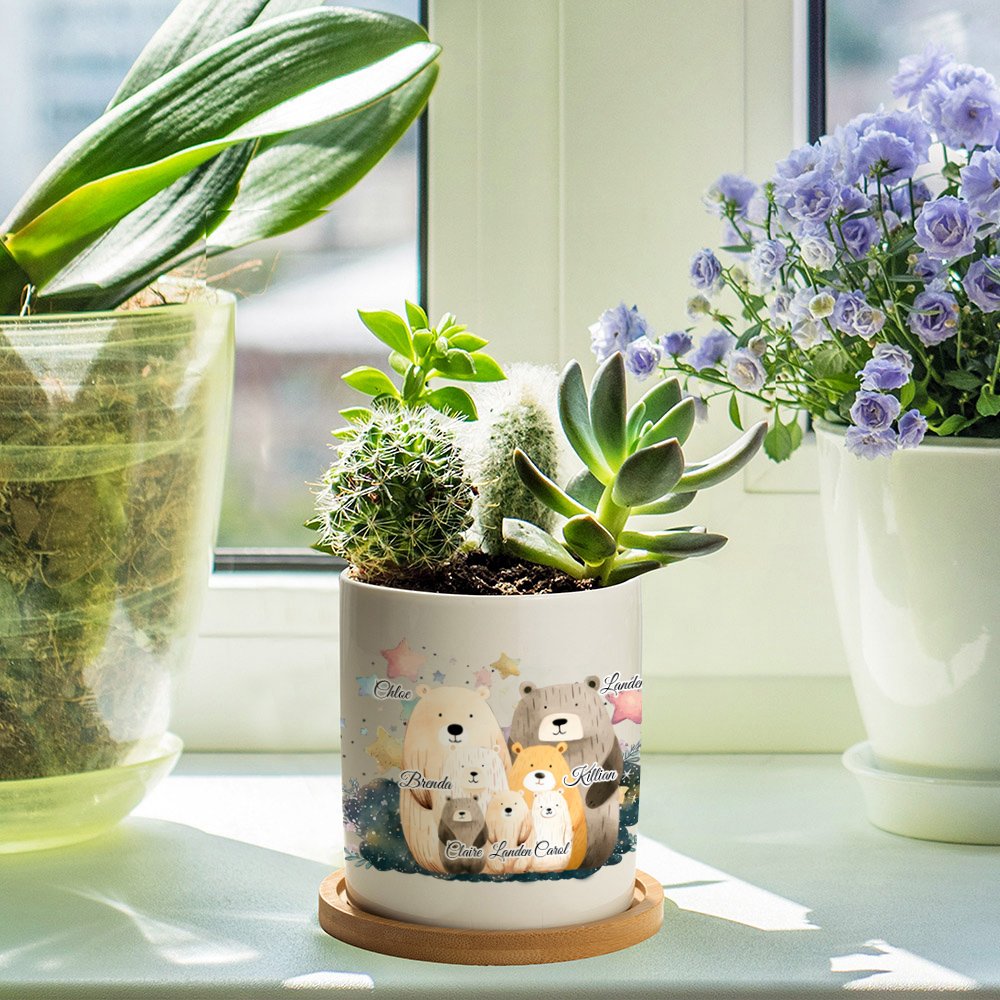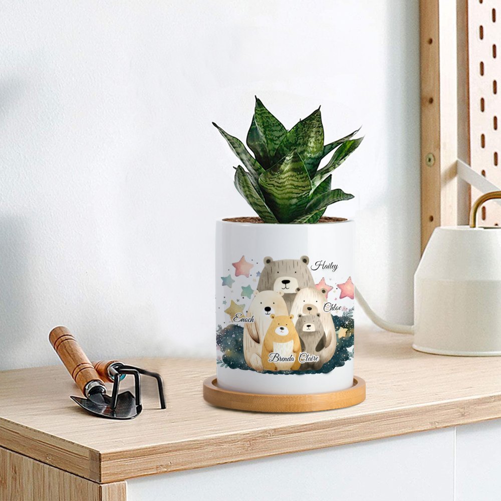 This plant pot features a cute bear design. It can be Personalised with 1–8 family member or friend names with 1-8 bears, reflecting the bond of family or friendship.