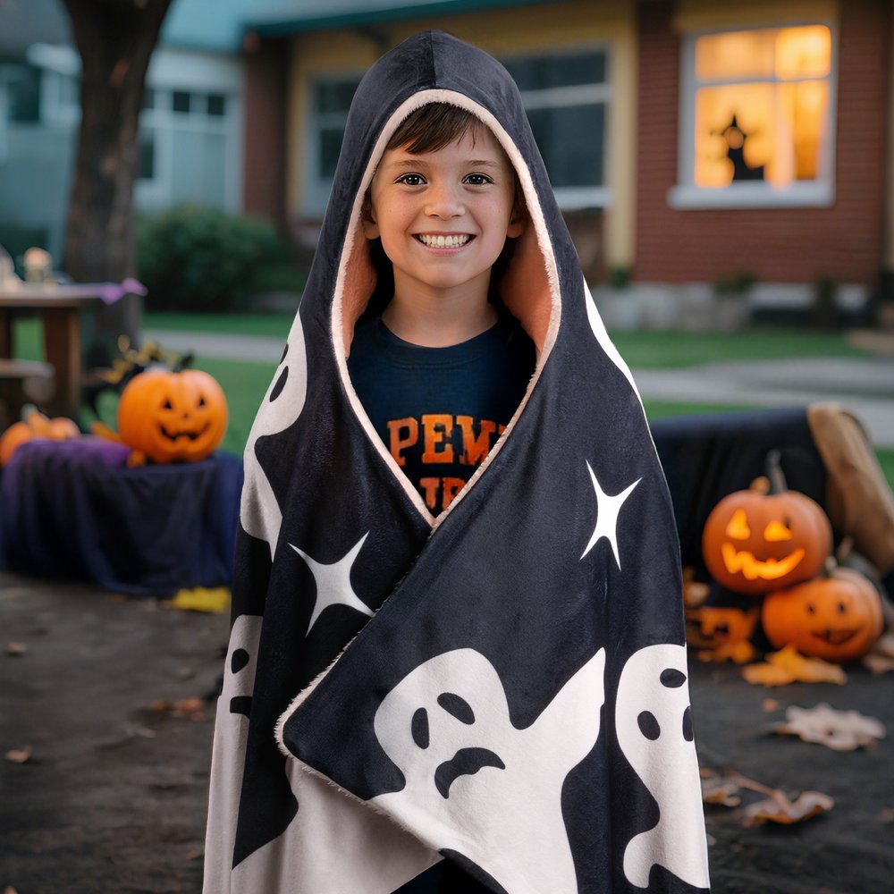 This hooded blanket combines style and practicality, making it a truly versatile item. At home, it keeps you warm and cozy during leisure moments like watching TV or reading; when traveling, it can be unfolded anytime to fend off the chill and provide intimate warmth. It’s even more useful during Halloween—not only does it serve as a festive home blanket to spruce up your space, but it also effectively keeps kids warm when they go out for "trick or treat". It effortlessly meets the needs of various scenarios.