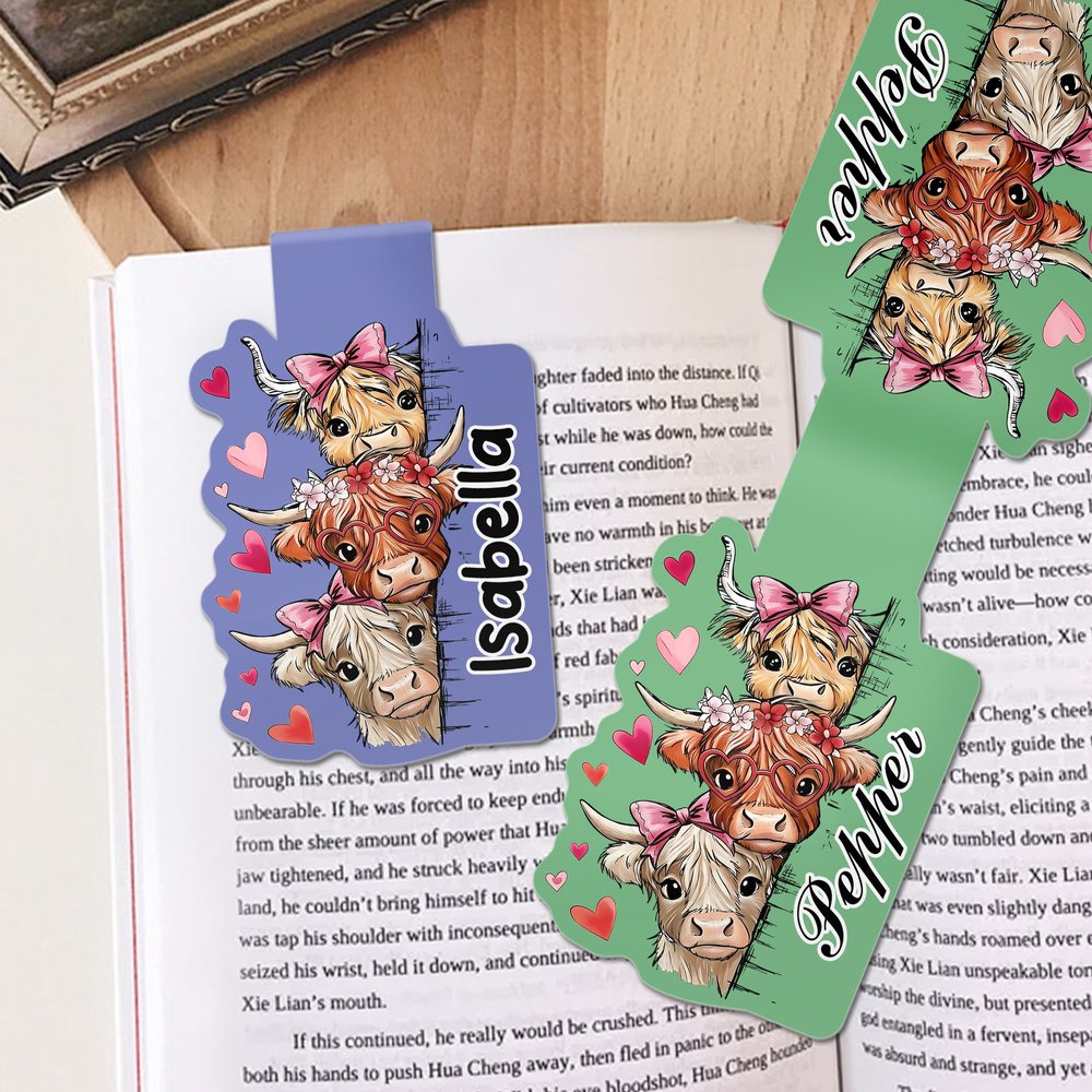 This adorable bookmark features a stack of fluffy Highland Cows with pink bows, hearts, or a cute floral crown, available in 12 soft macaron colours. It offers custom name personalization with 4 font choices, turning it into a unique, one-of-a-kind marker that reflects your style. The playful, whimsical design adds a sweet, cozy touch to every reading session.