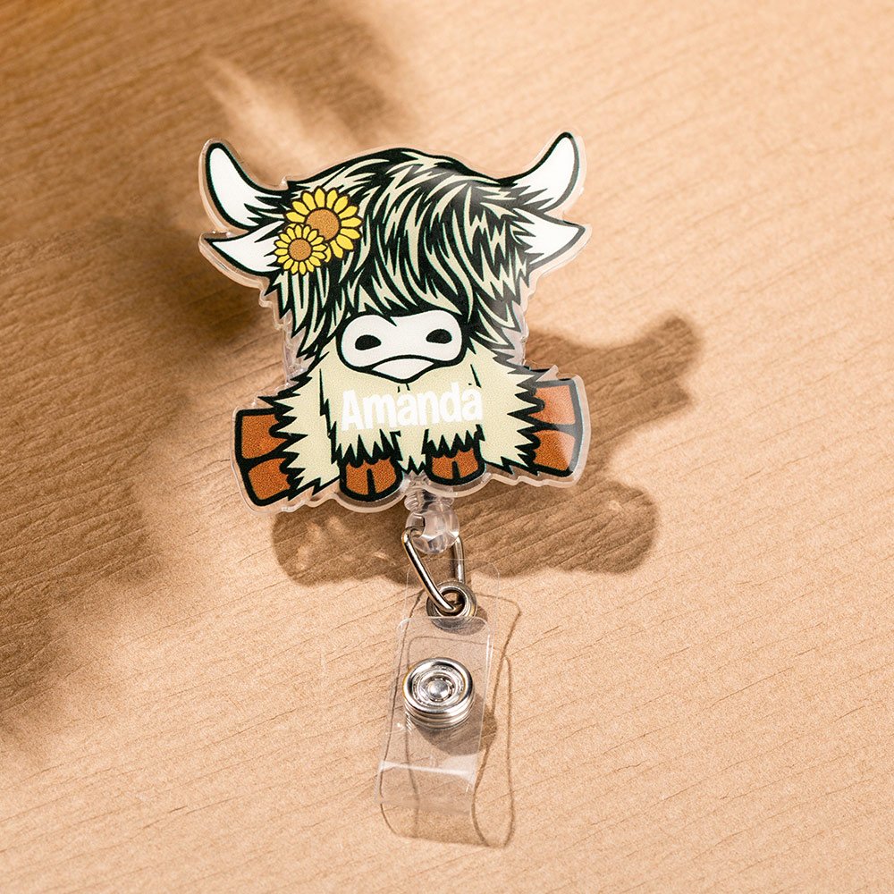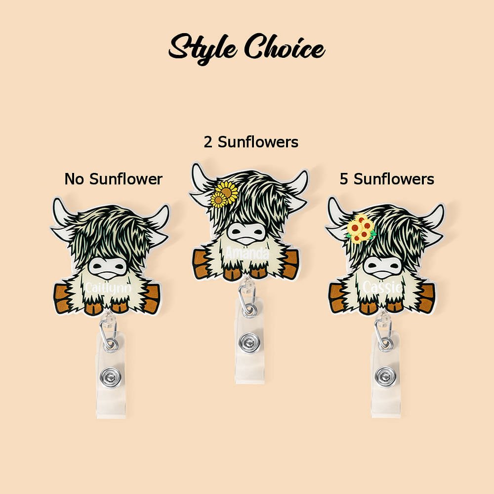 The badge features an adorable Highland Cow design with sunflowers for a very rustic look. There are also two different fonts for you to choose from, add your name to it to make the badge more eye-catching and unique.