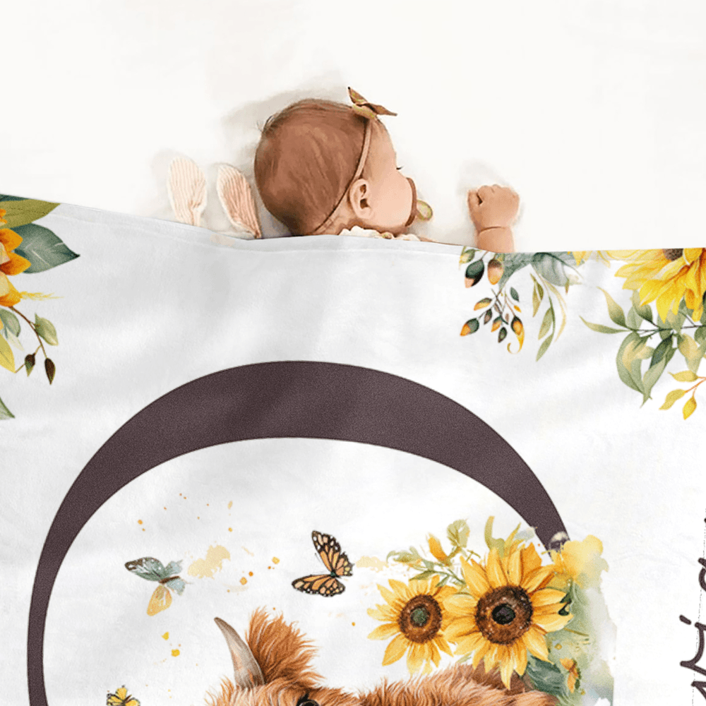 Featuring a cute Highland cow as the core element, paired with vibrant sunflowers, fresh flowers, and lively butterflies, this blanket exudes a childlike innocence and natural charm, perfectly suiting any child's aesthetic preferences. Customizable with your name and initial, and your choice of your favorite pattern, each blanket is truly one-of-a-kind.