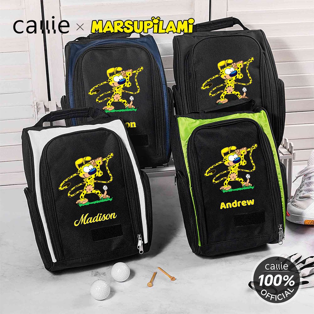 Created by Belgian cartoonist André Franquin in 1952, Marsupilami is a jungle-dwelling creature with yellow fur, black spots, and a super flexible, long tail. The bag features a vibrant cartoon of Marsupilami swinging a golf club, with your custom name. The design blends playful cartoon charm with a sleek, modern silhouette, creating a look that is both fun and sophisticated.