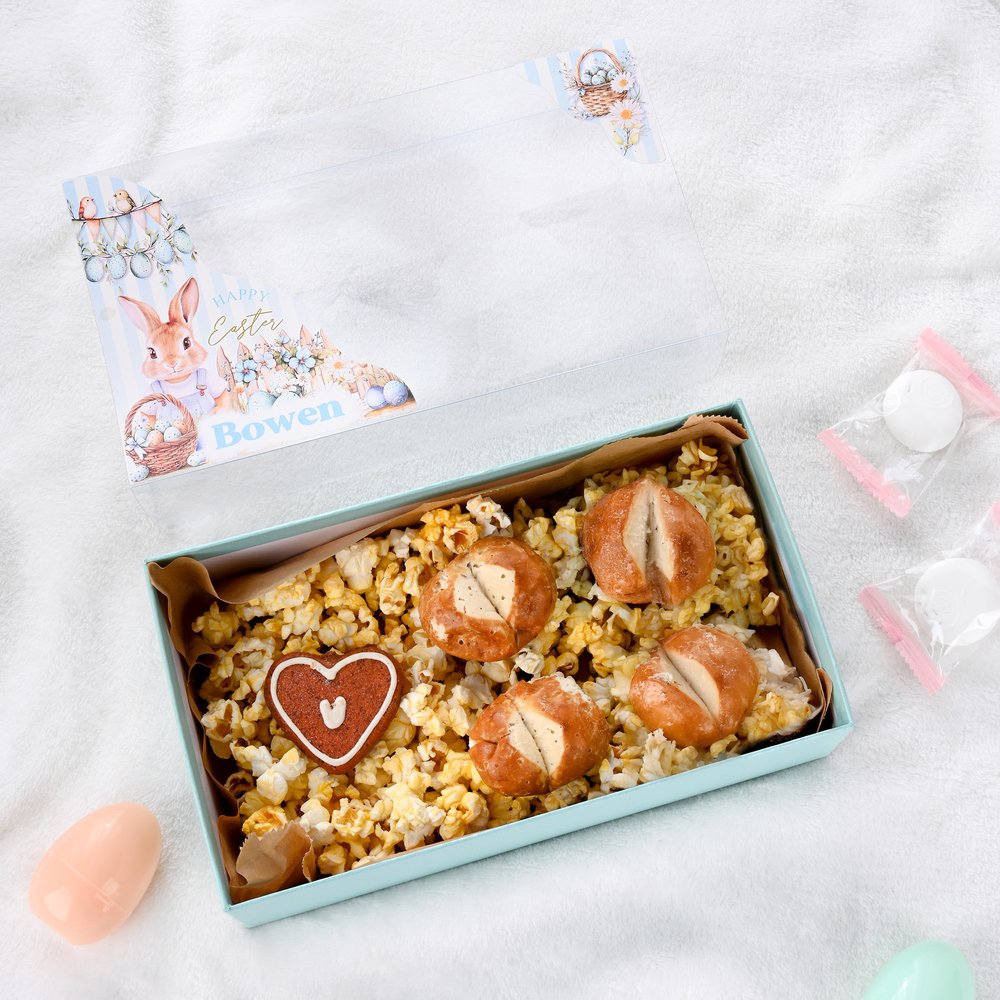 This Easter box features a Peter Rabbit theme, adorned with exquisite classic patterns on the exterior and a transparent lid that beautifully showcases the carefully arranged contents inside. The box supports personalization—you can have the recipient’s name on it, making it a unique keepsake for the holiday.