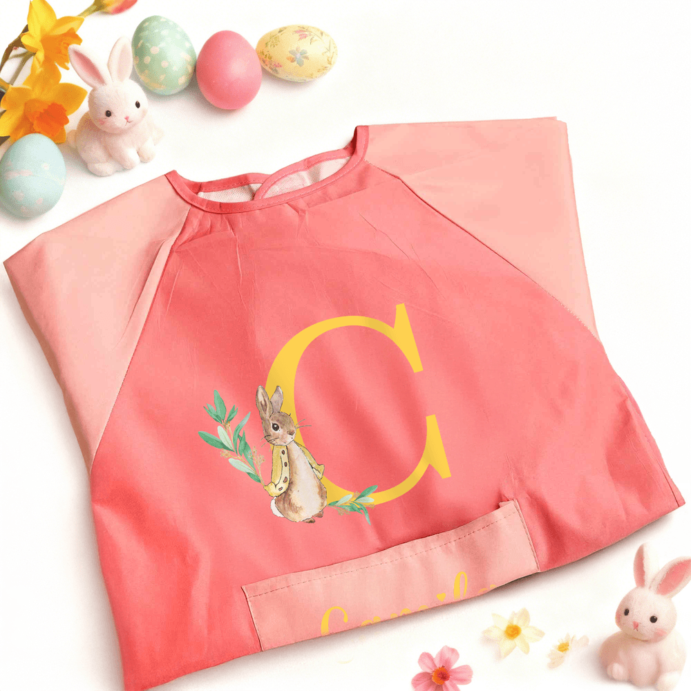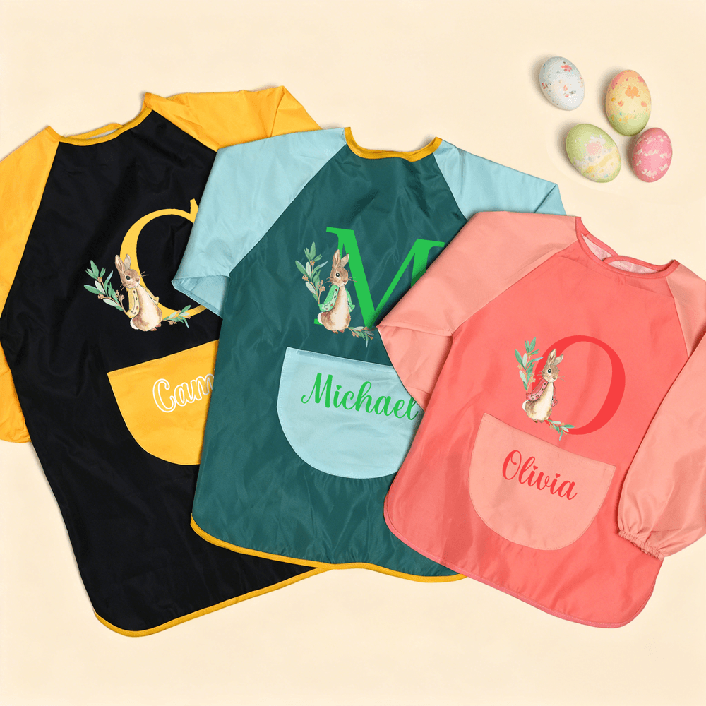Personalised Cute Peter Rabbit Waterproof Long Sleeve Kid Apron with Initial and Name Cooking Painting Handcraft Activities Easter Gift for Kids