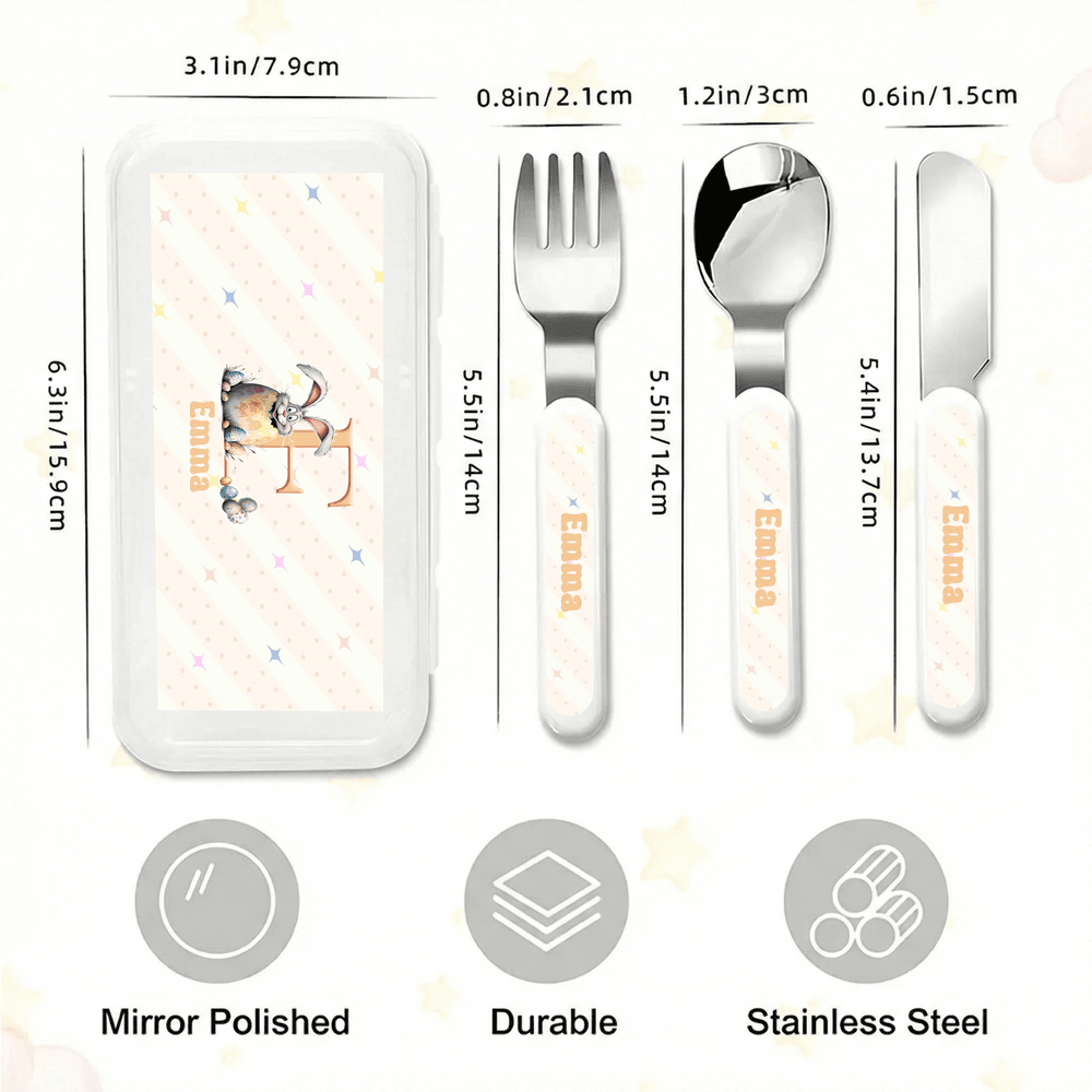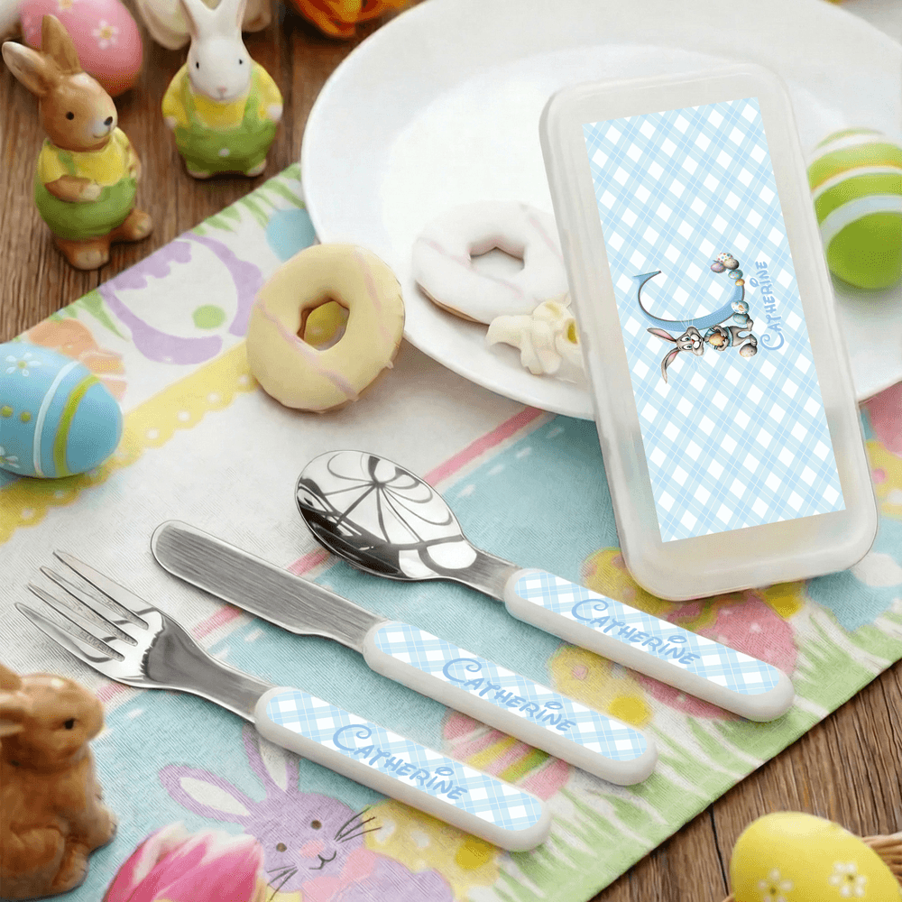 This adorable Easter-themed children's tableware set includes a knife, fork, spoon, and a matching storage box, all decorated with cute bunny patterns. You can customize it with your child's name and initials in a lively and charming font. It's also available in charming colours like soft pink or blue, and decorative background patterns such as checks, stripes, or polka dots. This practical tableware set is not only functional but also a unique keepsake, showcasing your child's personality and adding a festive springtime touch to mealtimes.