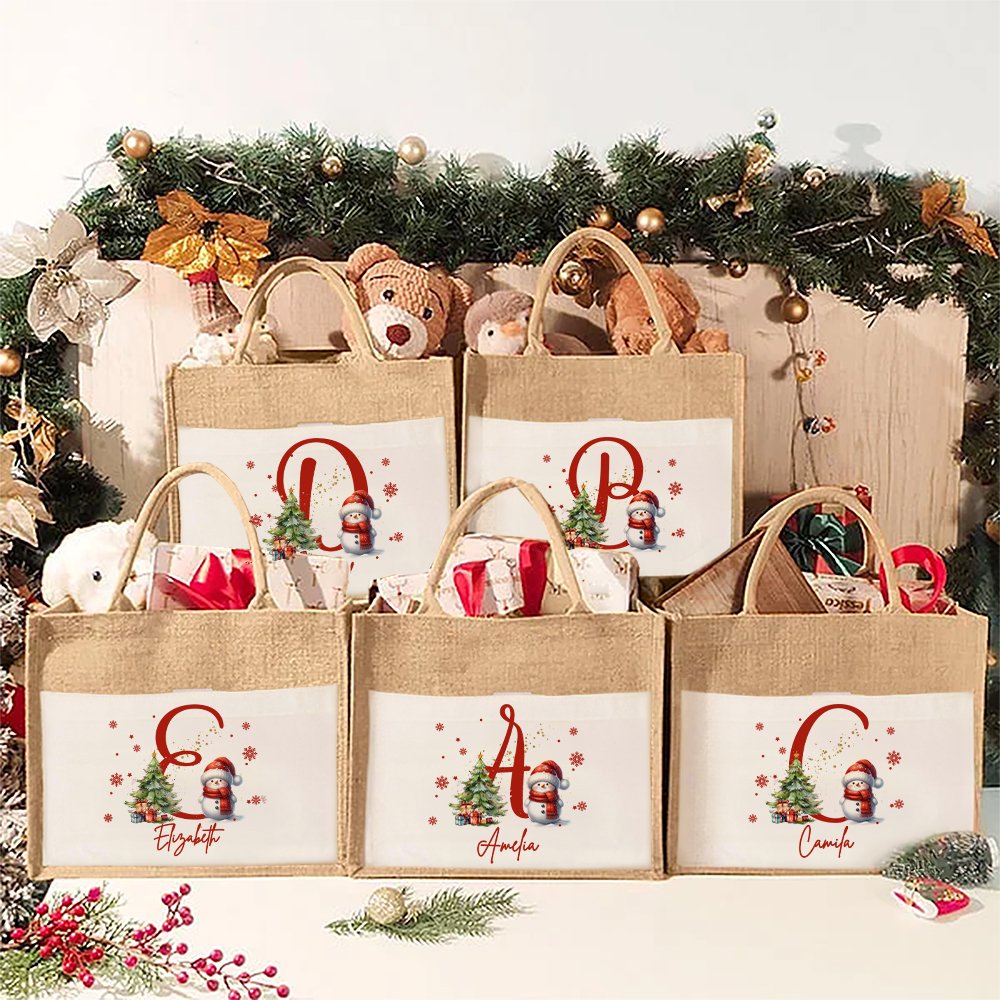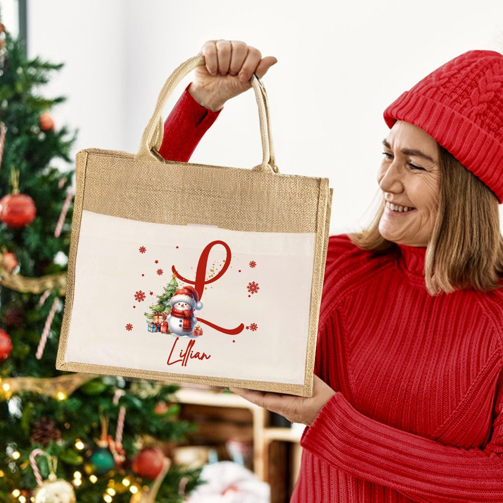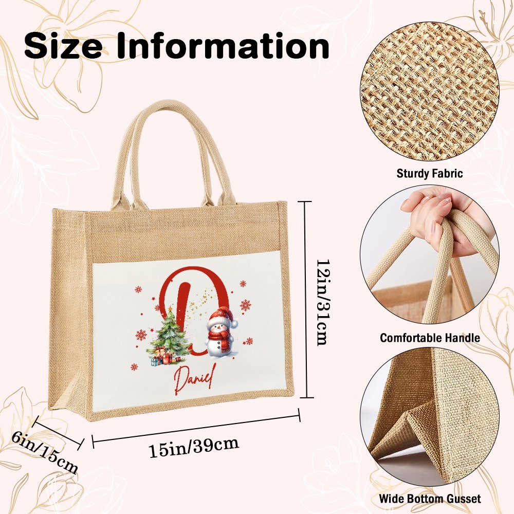 The tote prominently displays an initial and can be customized using the initial and name. The initial is surrounded by charming Christmas snowmen, trees, and presents, creating the perfect Christmas-themed look. The use of red, green, and gold accents enhances the festive atmosphere, capturing the essence of Christmas. Each piece represents winter cheer and is an outstanding Christmas accessory.