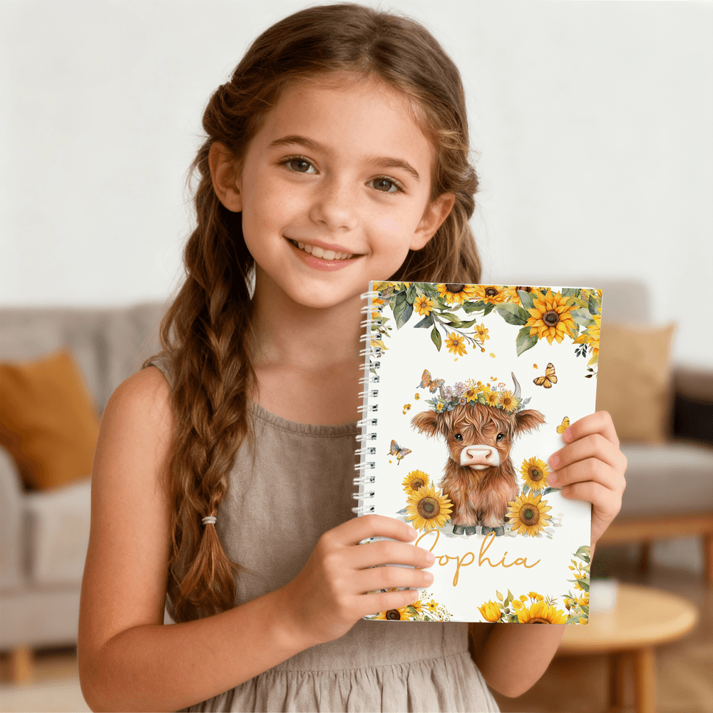 Centreed around vibrant sunflowers and adorable Highland cows, this design features customizable names for a uniquely personal touch. Its style blends playful energy with warm, comforting charm—sunflowers radiate sunny positivity while the Highland cow's playful silhouette is endearingly cute. This notebook transcends mere study or office tools, becoming an emotional vessel for affection that combines practicality with sentimental value.