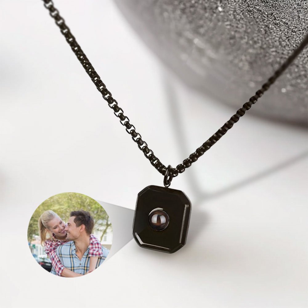 This necklace boasts a modern, masculine design that seamlessly blends with any outfit. Its sleek geometric pendant and projection photo element create a refined and contemporary look, making it a stylish accessory for the modern gentleman.