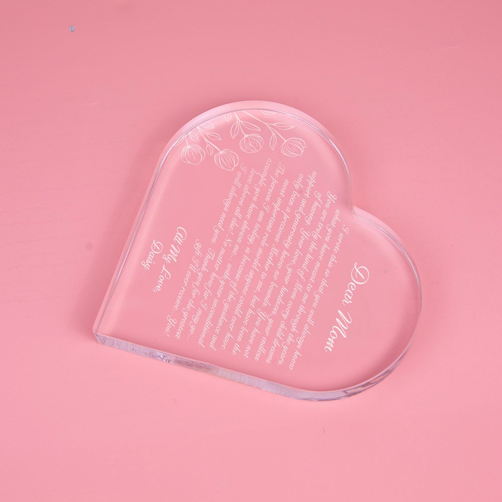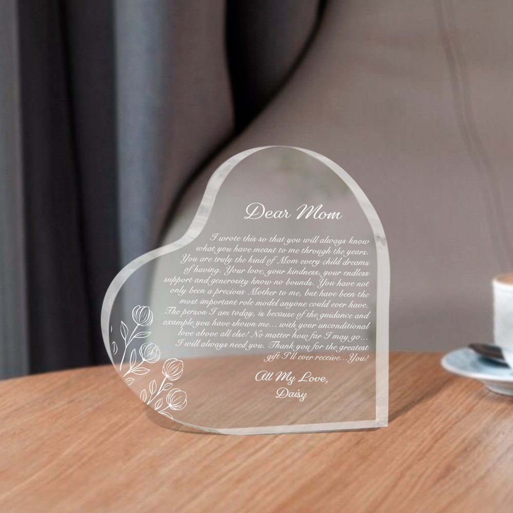 Mom always has a special place in our hearts, and you can never tell her enough how much she means to you. Mom always has a special place in our hearts, and you can never tell her enough how much she means to you. The heart plaque can be custom warm and touching words to your mom that convey your love to make a truly one-of-a-kind ideal gift.