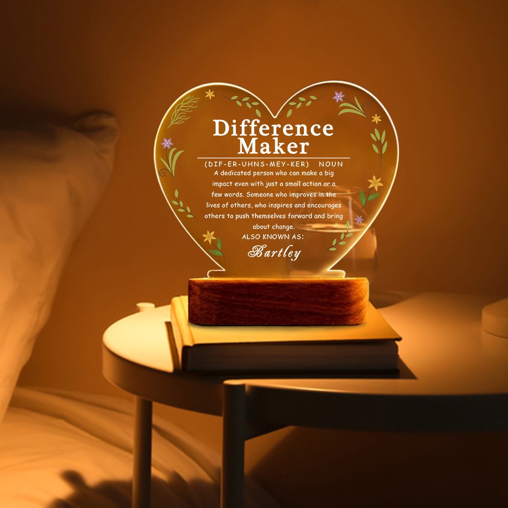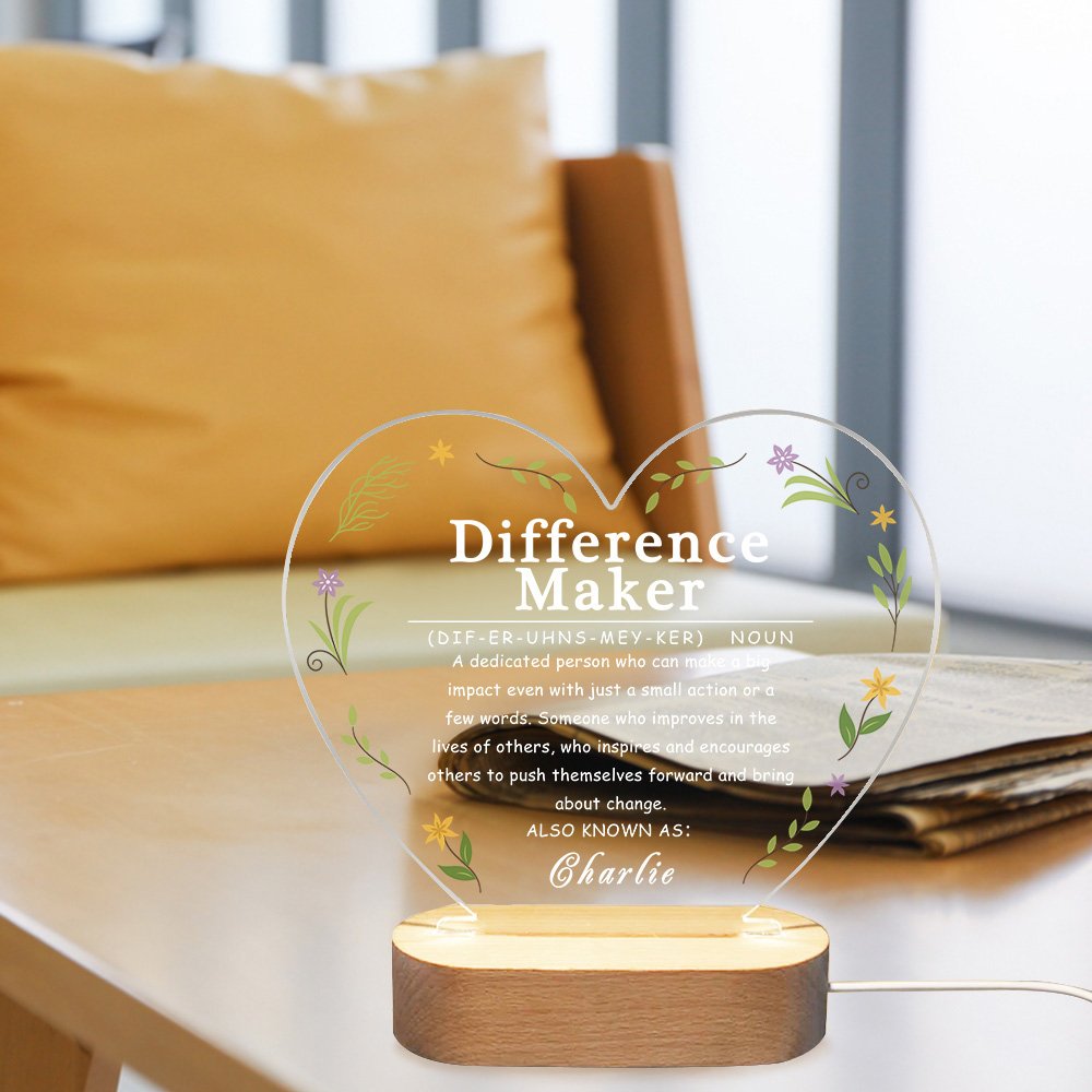 This heart night light has flowers around the edge and the words "Difference Maker" printed in the middle, with a detailed definition describing a dedicated person who can make a big impact even with just a small action or a few words. This design is not only beautiful but also serves as a source of inspiration and motivation. The personalised name design gives this difference maker a concrete form.