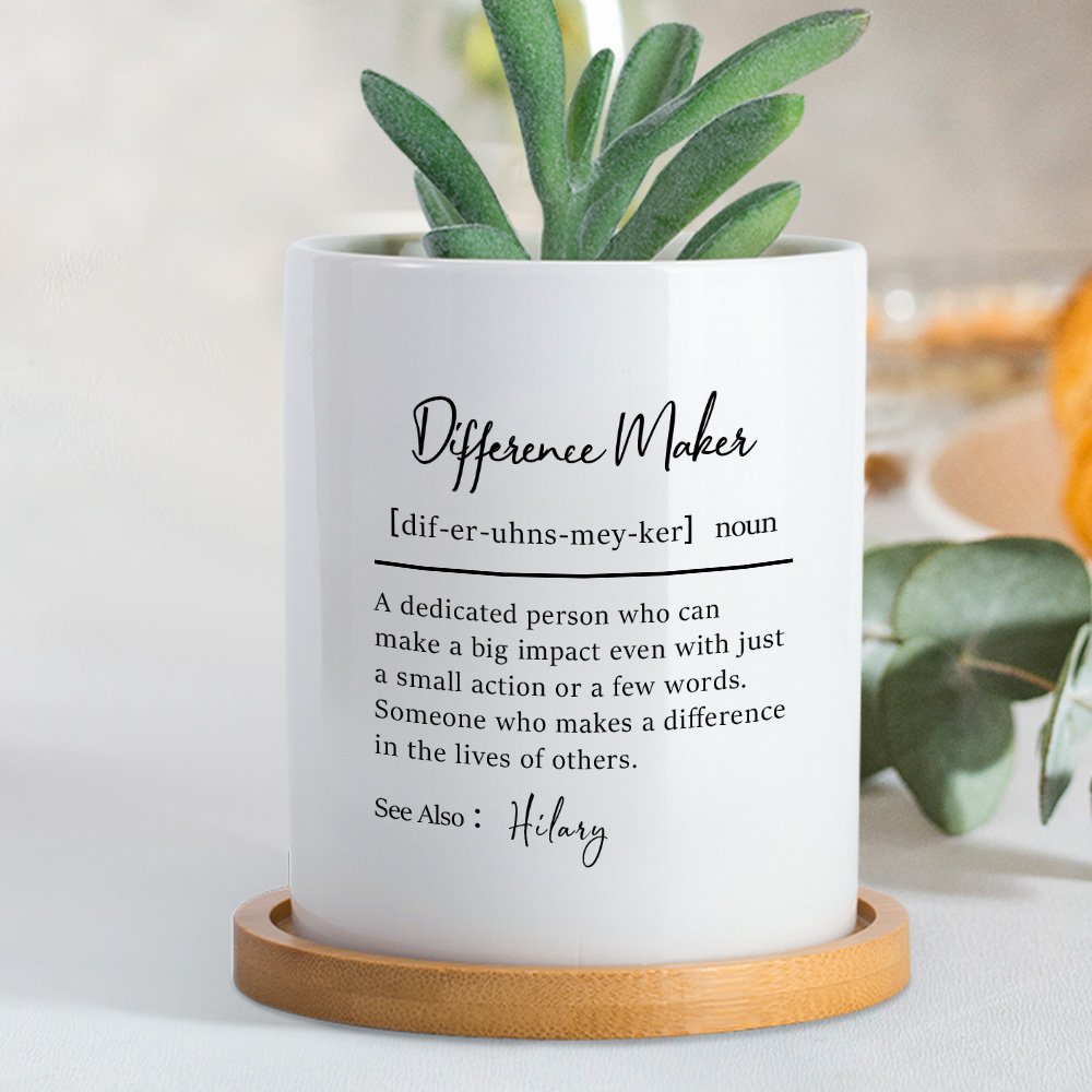 This planter pot features a unique design and motivational message. The planter pot is emblazoned with the definition "Difference Maker," highlighting people whose small actions or a few words can make a big difference. This design is not only beautiful but also inspiring, encouraging, and recognizing those who make a positive contribution to their daily lives. You can also customize the name on the planter pot to make it more specific.