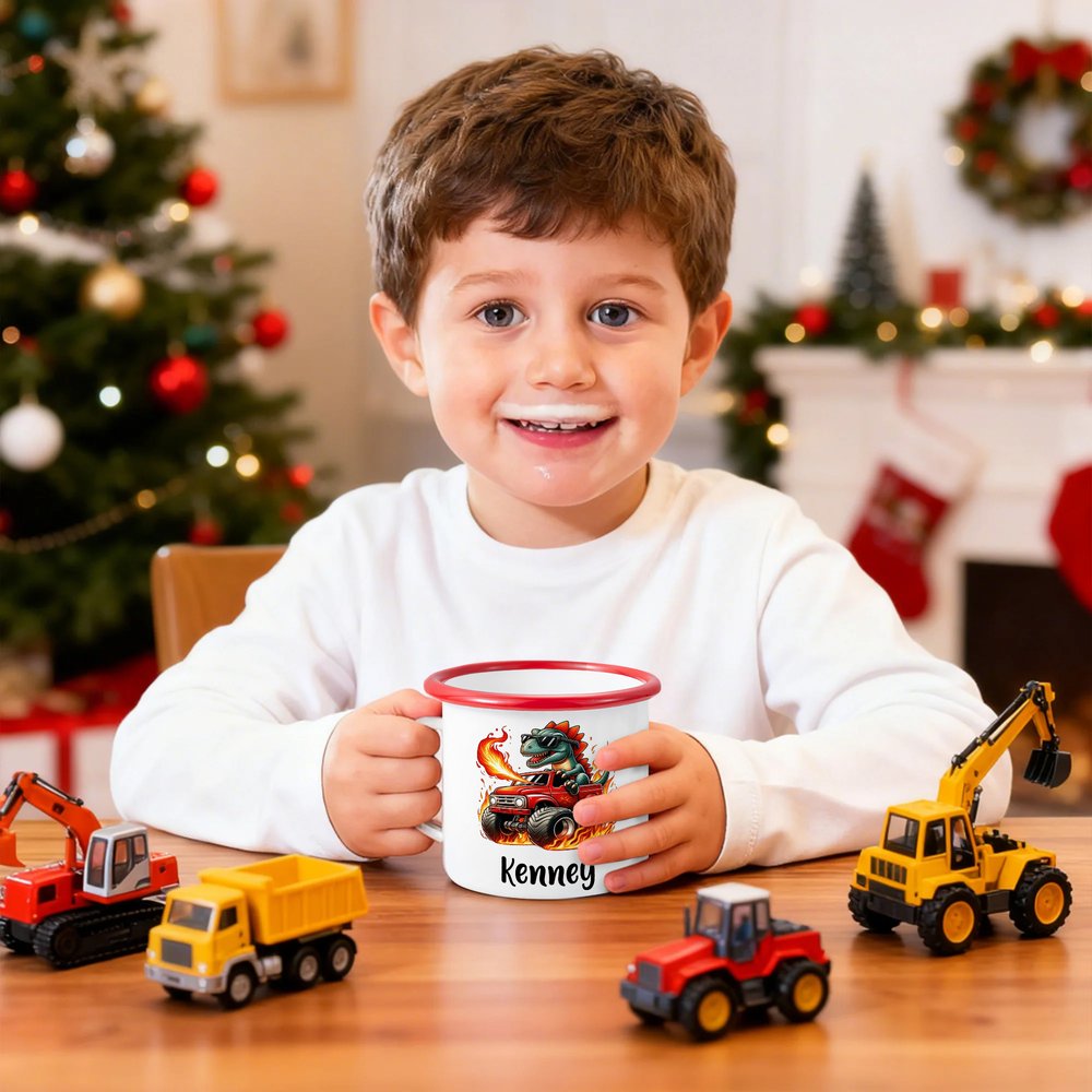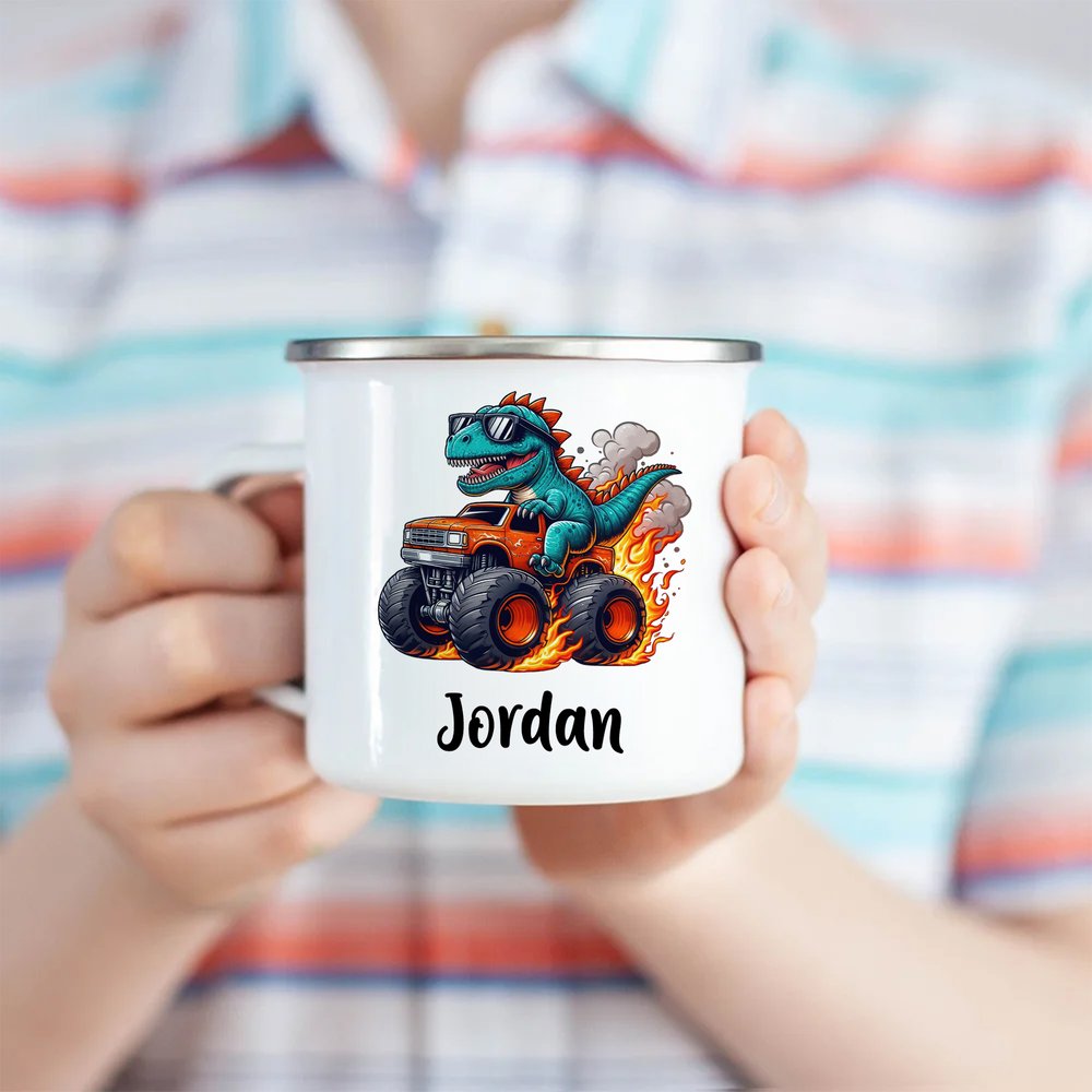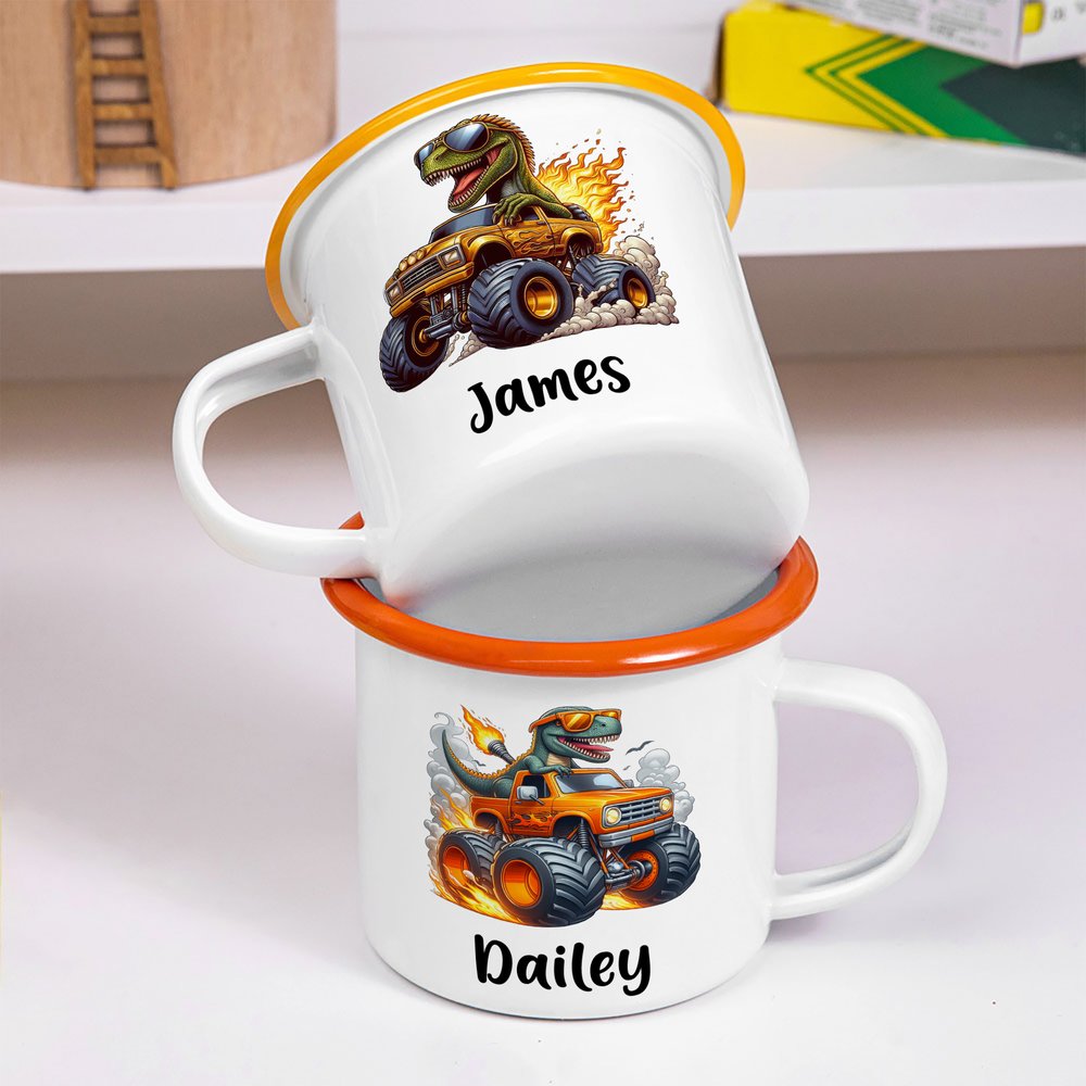 Personalised Dinosaur Lorry Multicolour 12 oz Enamel Mug with Name Birthday Christmas Gift for Kids Dinosaur Lorry Lovers