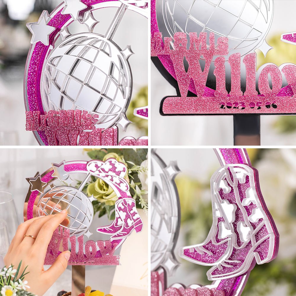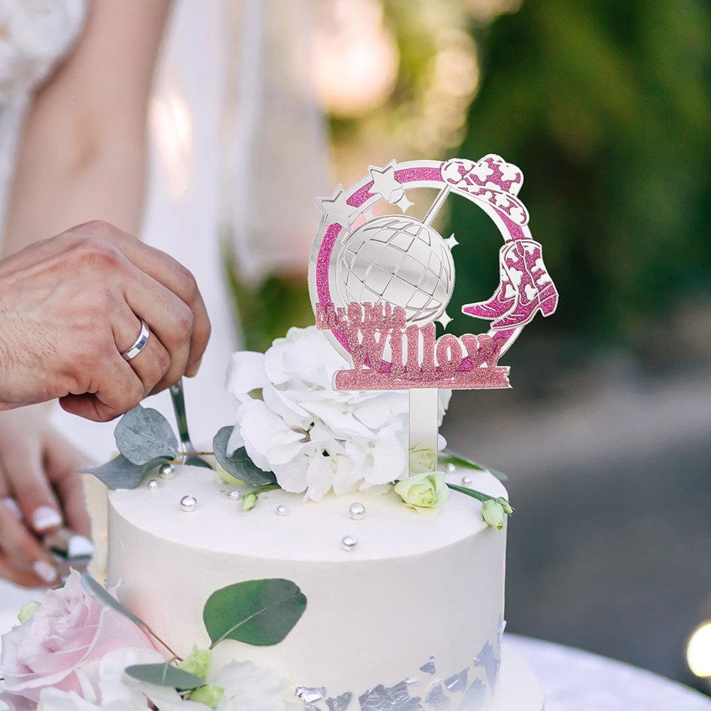The design of this topper features a disco ball and cowboy hat, cowboy boots element, which dds a playful yet sophisticated touch. The ability to Personalise it with your name and the date of your wedding or anniversary adds a special, intimate touch, making it not just a decoration but a cherished keepsake.