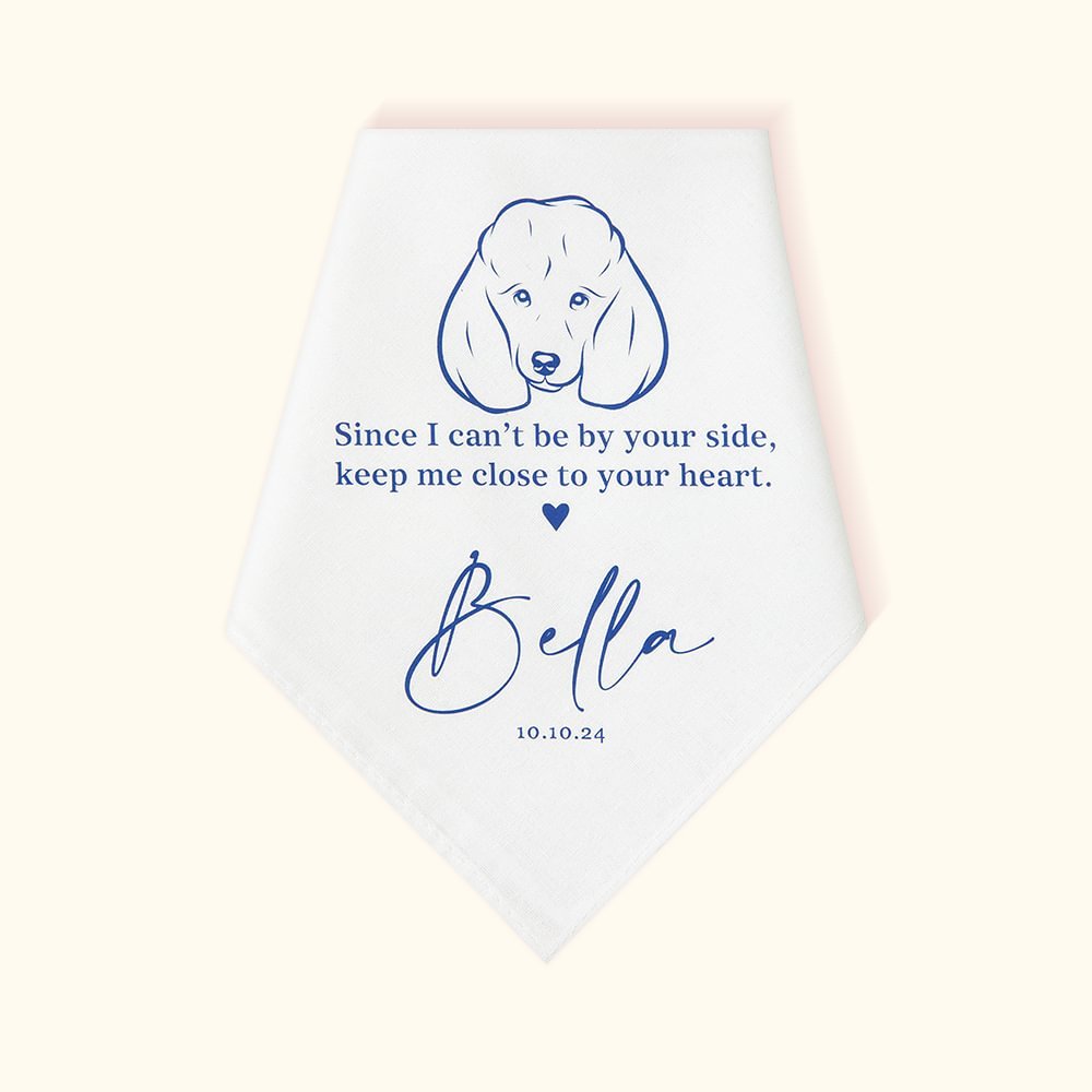 Each handkerchief is adorned with a simple yet meaningful sentiment: "Since I can't be by your side, keep me close to your heart." This heartfelt message beautifully captures the love and bond shared with your four-legged friend, making this handkerchief a sentimental and cherished wedding or memorial service gift.