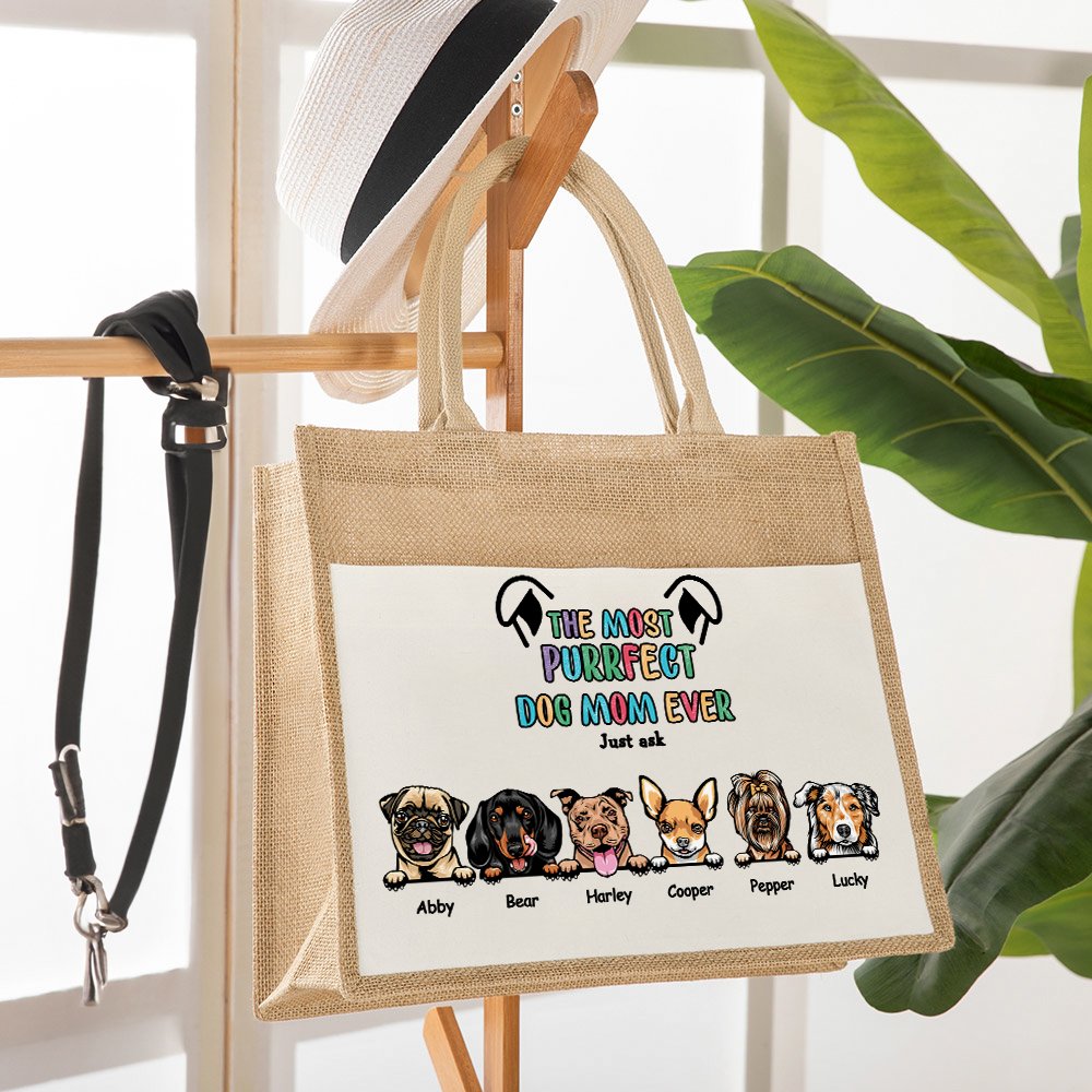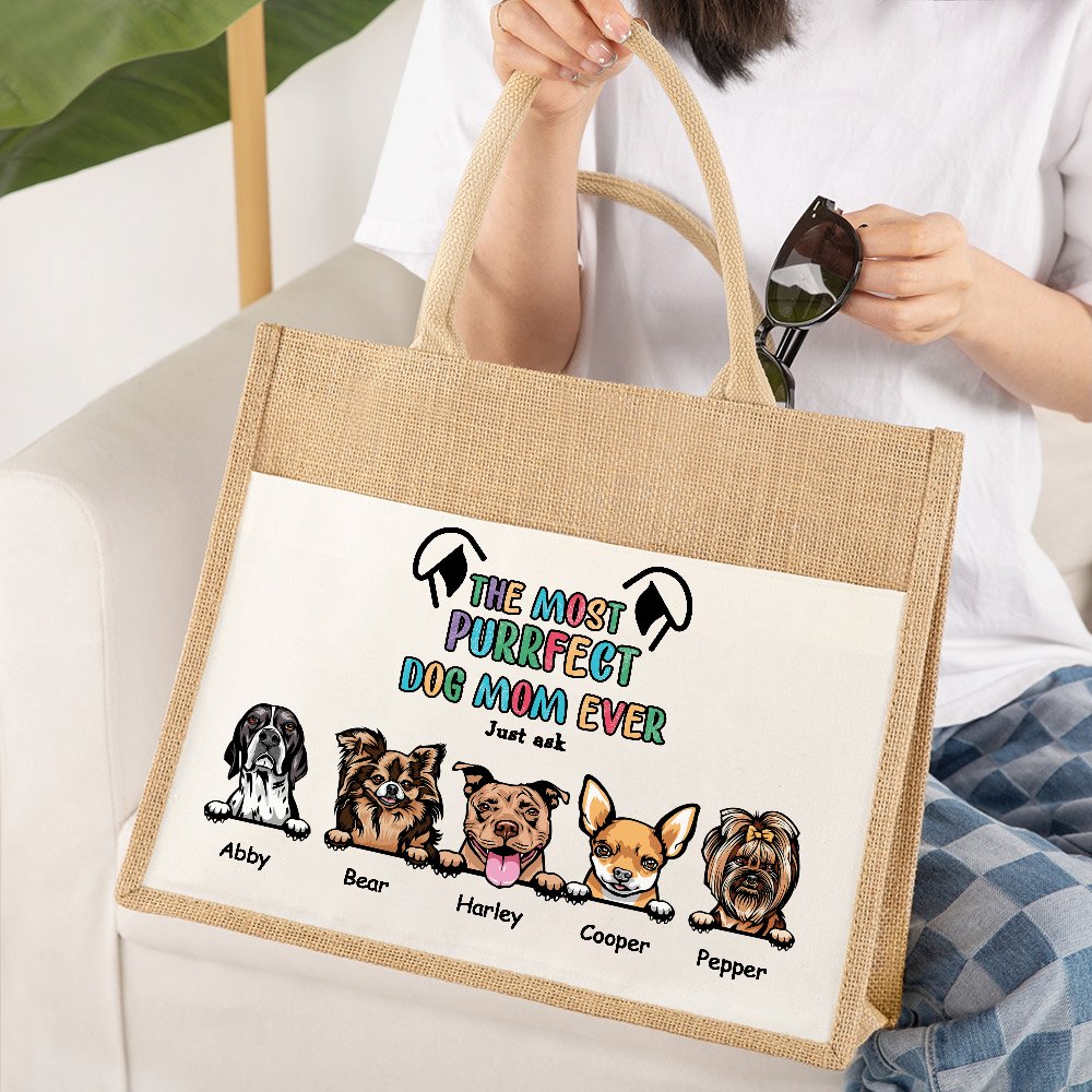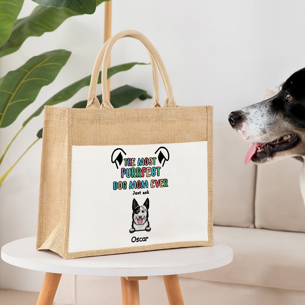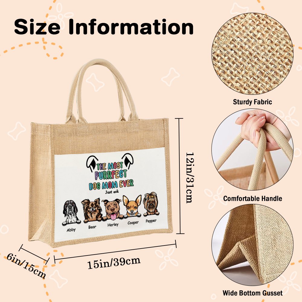 This bag is a combination of jute and canvas materials, exuding a rustic charm. The natural texture adds a touch of flair to the bag. The bag comes with the text "The Most Purrfect Dog Mom Ever," which expresses special praise and affection for the dog's mother. You can choose from 1-6 dogs and add their names to make each dog unique.