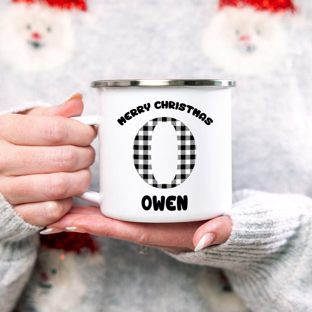 This 12 oz enamel mug features customizable designs—choose from plaid patterns 9 colours available, initial, pet paw print, and add names to create a unique festive piece. The “Merry Christmas” slogan fills your space with holiday cheer, making it a one-of-a-kind Christmas essential.