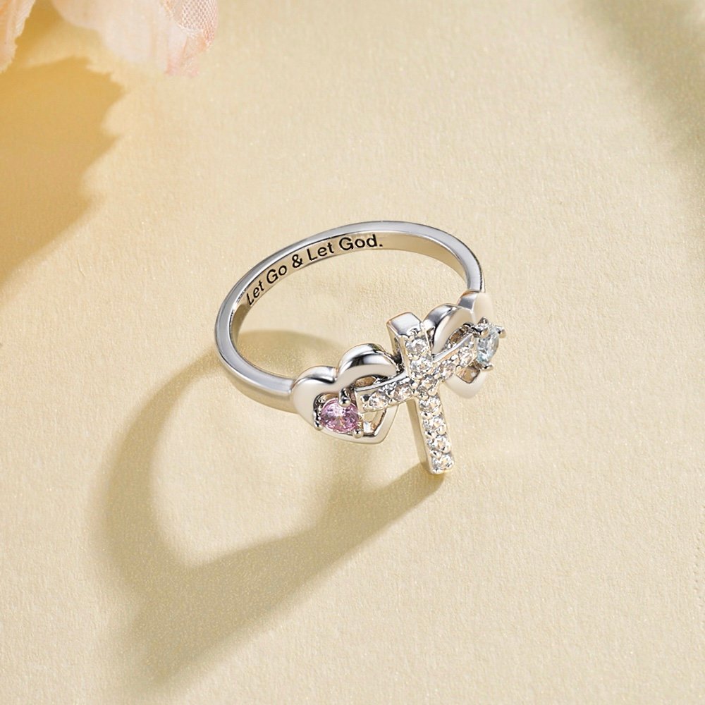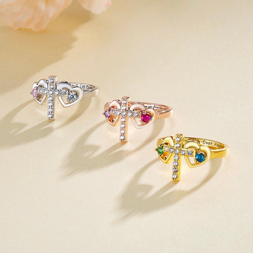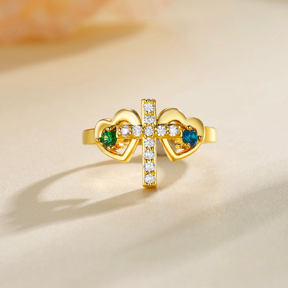 The two hearts symbolize love and connection, while the birthstone adds a personal touch that makes this ring unique. The cross element adds a touch of elegance and spirituality, making it a perfect choice for Christian women. Whether people wear it every day or save it for special occasions, this ring will become a cherished jewellery piece.